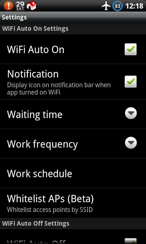Auto WiFi Toggle — приложение, которое при потере соединения с WiFi точкой доступа, автоматически отключит WiFi модуль в Вашем Android телефоне. В настройках можно указать через какой промежуток времени отключить модуль от 0 до 10 мин., а так же отображать или нет иконку в панели уведомлений.