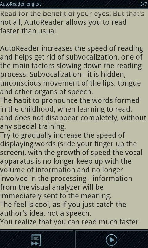 Читайте с пользой для ваших глаз! Но это еще не все, AutoReader позволяет читать быстрее чем обычно. AutoReader повышает скорость чтения и помогает избавиться от артикуляции, одного из основных факторов замедляющих чтение. Артикуляция — это скрытое, непроизвольное движение губ, языка и других органов речи. Привычка проговаривать слова формируется в детстве, когда учатся читать, и не исчезает полностью, без специальной тренировки. Попробуйте плавно повышать скорость показа слов (движением пальца вверх по экрану), с ростом скорости речевой аппарат перестает успевать за объемом информации и перестает участвовать в обработке — информация из зрительного анализатора сразу будет направляться в смысловой.