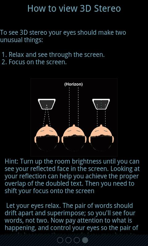 Все это позволяет превратить чтение в полезный и увлекательный процесс, а также снизить нагрузку на глаза. AutoReader позволяет читать гораздо более крупный текст, что важно не только для людей с ослабленным зрением. Но и например в транспорте, на ходу, на бегу, на велотренажере и т.д. когда фокусировка на мелком тексте утомительна для глаз или невозможна. Режим 3D Stereo может быть даже полезным для глаз, так как при правильном подходе зрительные оси направлены параллельно (как при взгляде на горизонт), что расслабляет наружные глазные мышцы, а фокус осуществляется на стерео паре, что помогает синхронизировать фокусировку обоих глаз, что также полезно, так как зачастую один глаз фокусируется хуже другого (мы можем этого не замечать, а просто чувствовать усталость).