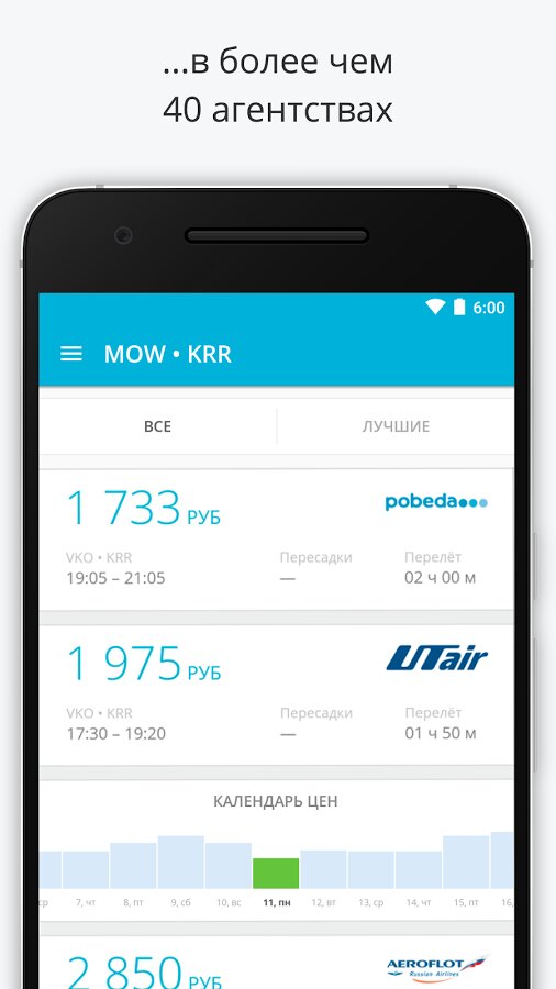 Поиск билетов осуществляется не только на сайтах авиакомпаний, но и в зарубежных авиакассах. Тем самым давая всем своим пользователям шанс выбрать не только самый дешевый билет, но и достойные условия перелета. Также Aviasales оснащен удобным поиском и множеством фильтров. А купить все билеты можно прямо в своем гаджете.