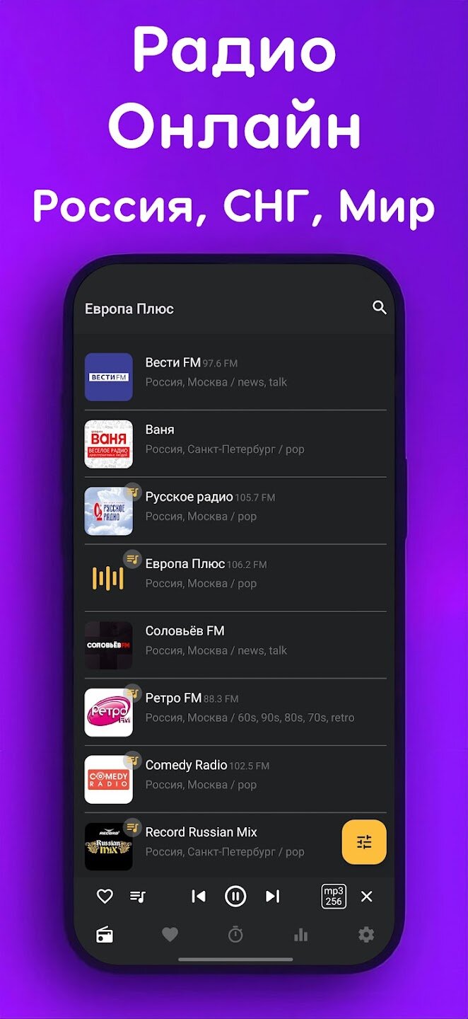 - Тысячи радиостанций со всего мира с обширным каталогом российских станций