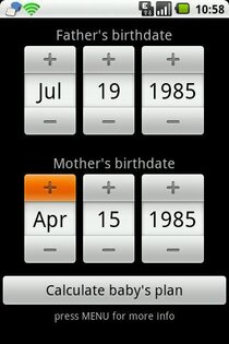 BabyPlan — с помощью этого приложения для Android-смартфонов вы сможете более точно спланировать пол вашего будущего ребенка. В основе расчета лежит алгоритм, вычисляющий число полных лет отца и матери.