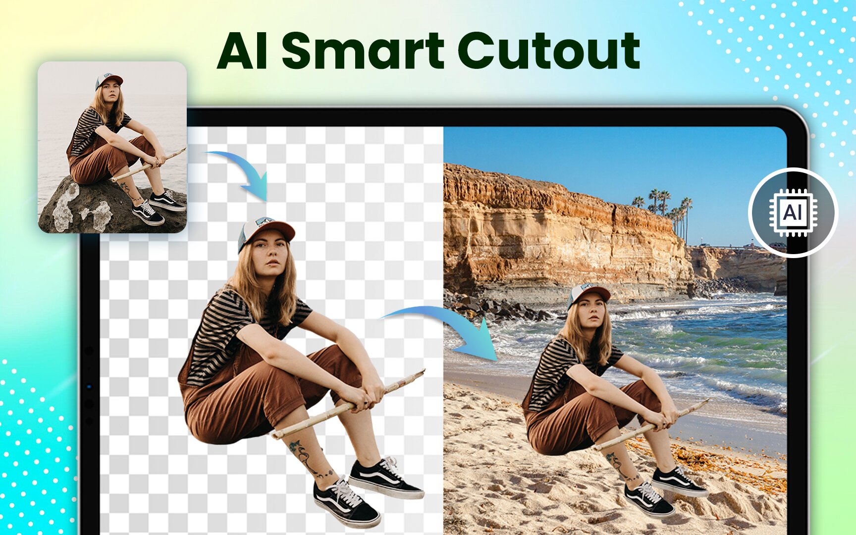 - Удаление фона с помощью искусственного интеллекта одним касанием для мгновенного получения прозрачных изображений в формате PNG.