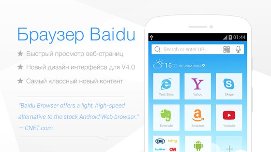 Baidu Browser — это еще один легкий и быстрый браузер от китайских друзей. Приложение имеет «под капотом» движки нового поколения для обработки HTML5 (T5 Engine) и javascript, обеспечивающих, по заверениям разработчиков, 20-процентный прирост скорости в сравнении с основными конкурентами в лице Google Chrome и Opera.