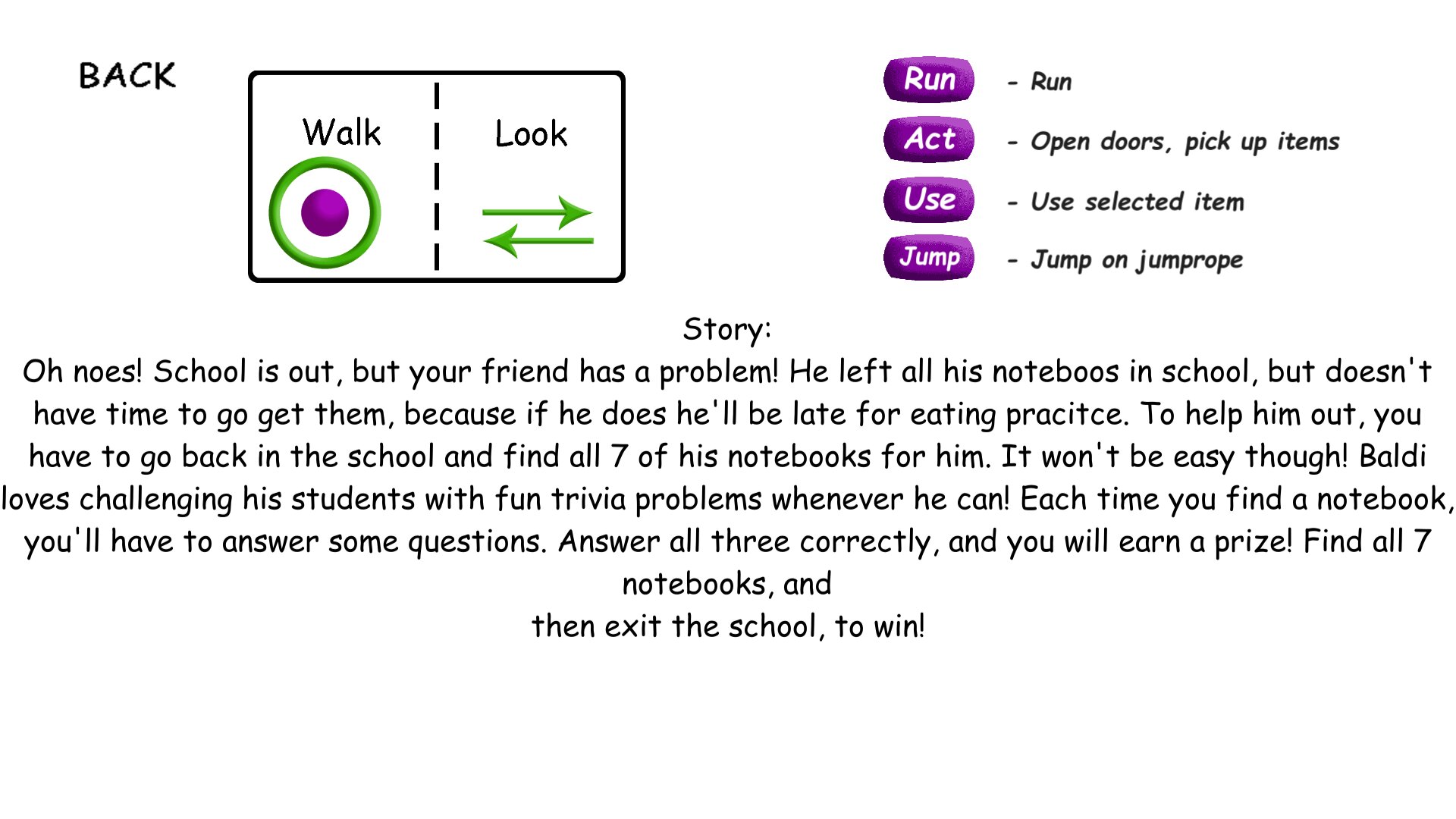 На пути к тетрадям у вас будет множество препятствий — будто директор, который будет вас ловить, если увидит что вы бегаете; девочка со скакалкой, которая не отстанет, пока вы с ней не поиграете, или просто Балди, который если вас поймает, то игра будет окончена. Также, не стоит забывать, что игра является хоррором. По этому, НЕ ДАВАЙТЕ ИГРАТЬ В ЭТУ ИГРУ ДЕТЯМ!