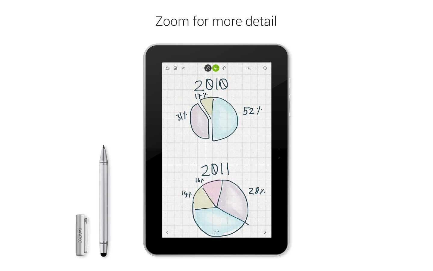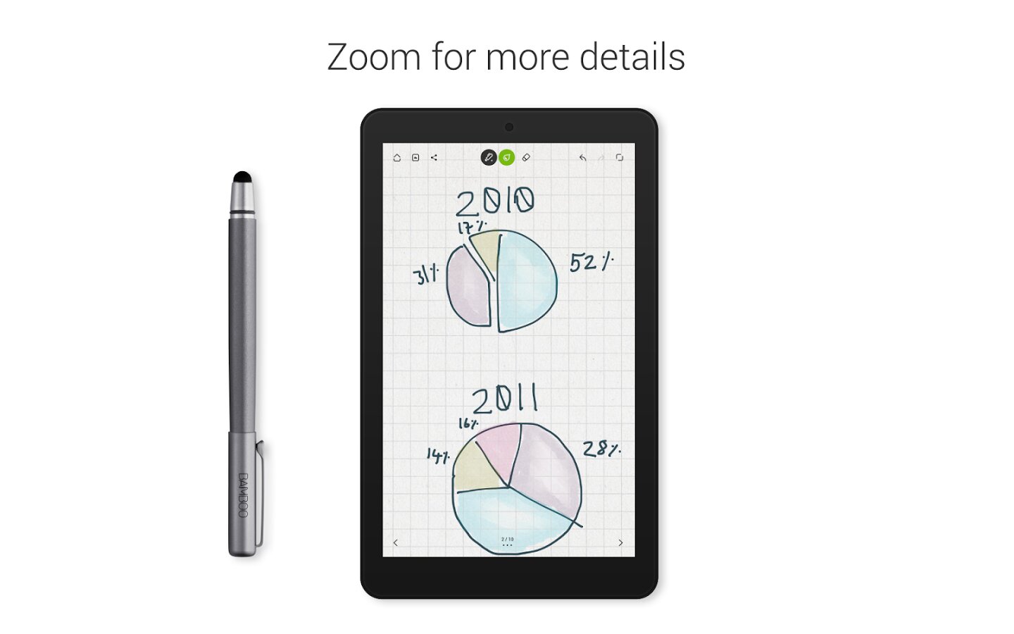 - ДОБАВЛЕНИЕ МЕЛЬЧАЙШИХ ДЕТАЛЕЙ. Благодаря нашей уникальной функции масштабирования Вы можете рисовать или вручную наносить тонкие линии и умещать на странице больше заметок.