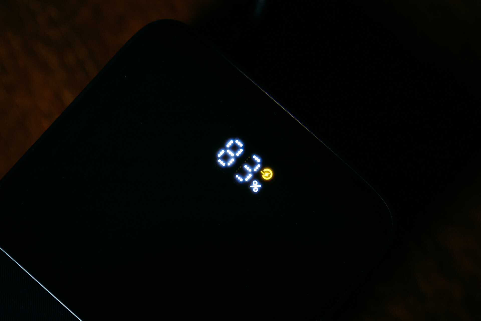 В верхней части лицевой панели можно заметить небольшой цифровой дисплей — здесь отображается текущий уровень заряда аккумуляторной батареи повербанка.
