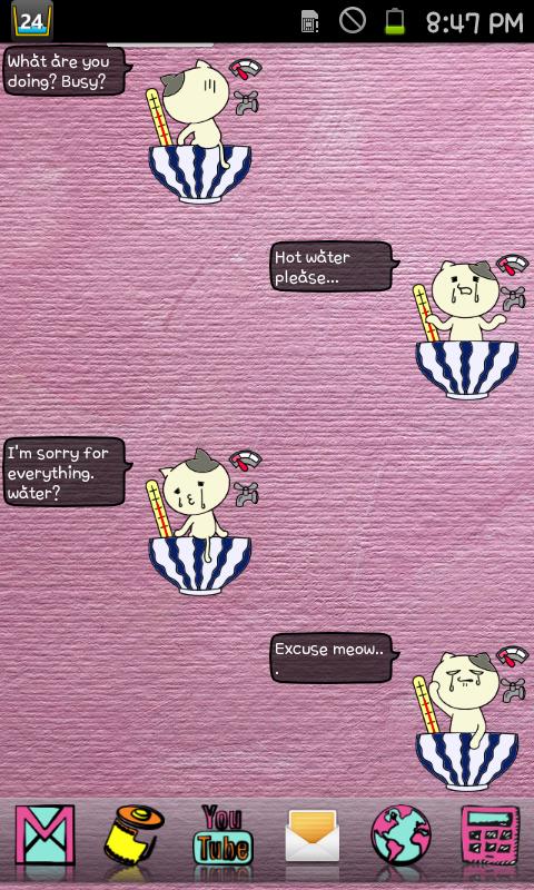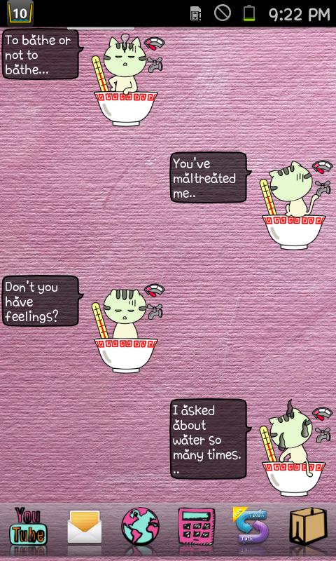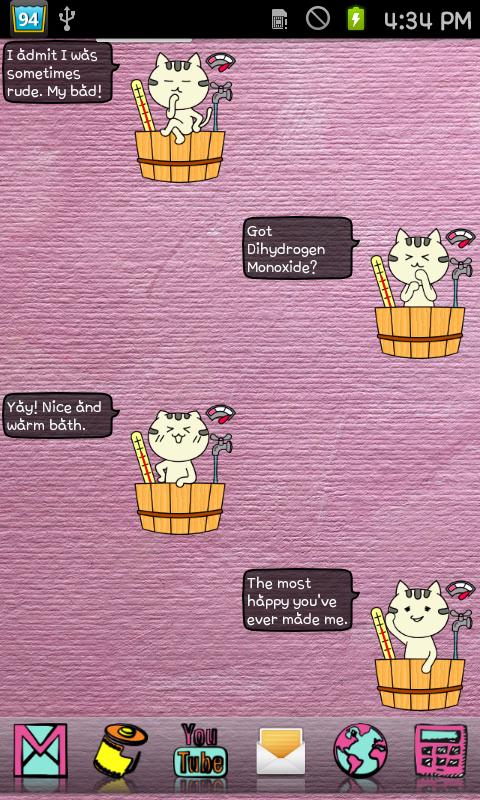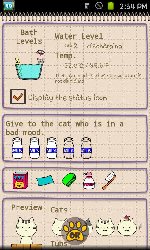 BathingCat — забавный виджет состояния батареи. Об уровне зарядки и температуре батареи вас информирует кот, сидящий в ванне. Уровень воды в ванне = уровень заряда батареи, а температура воды = температуре батареи.