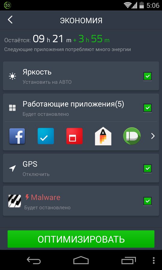 - Показывает насколько будет увеличено время работы батареи при отключении Bluetooth/WiFi и других функций.