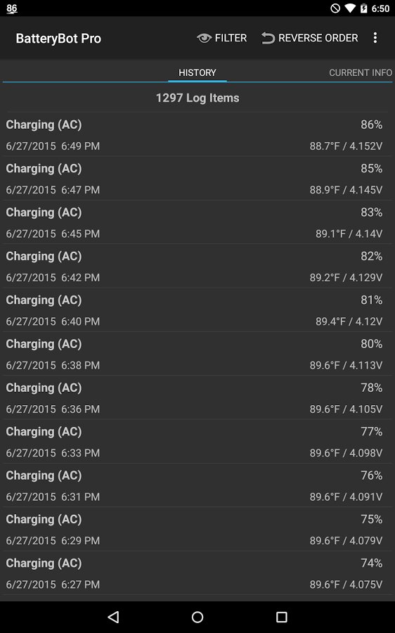 - Показывает статистическую информацию последних зарядок и разрядок (время, уровень, скорость).