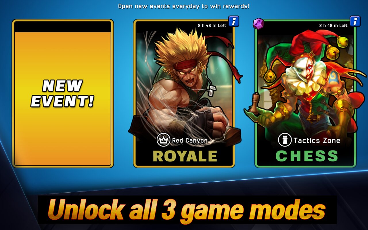 - Открывайте динамичные режимы событий, такие как «Арена», «Рояль» и «Шахматы» каждый день. Получайте новых героев через награды и получайте удовольствие от прокачки.