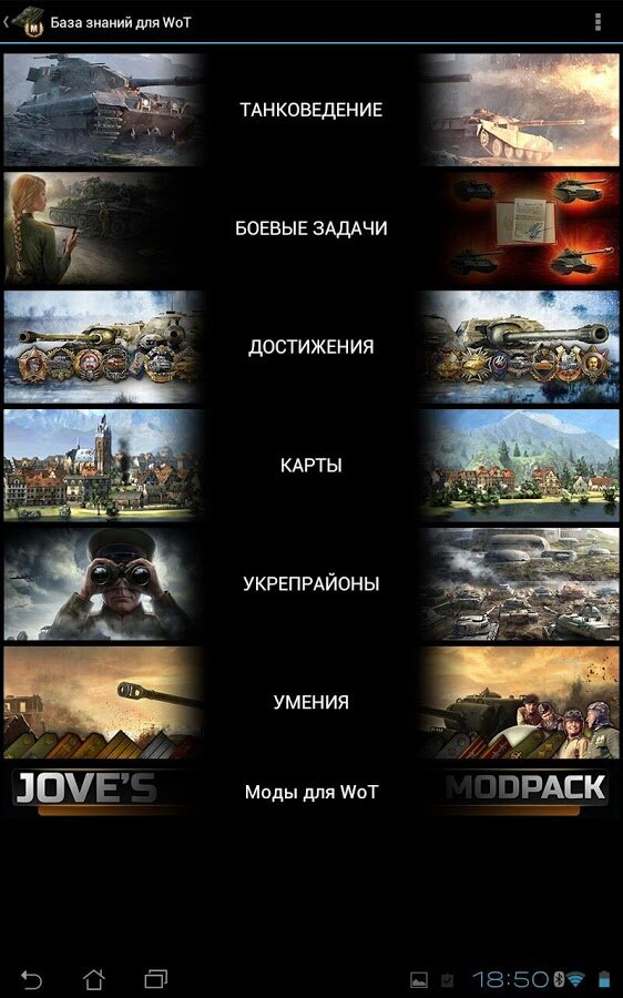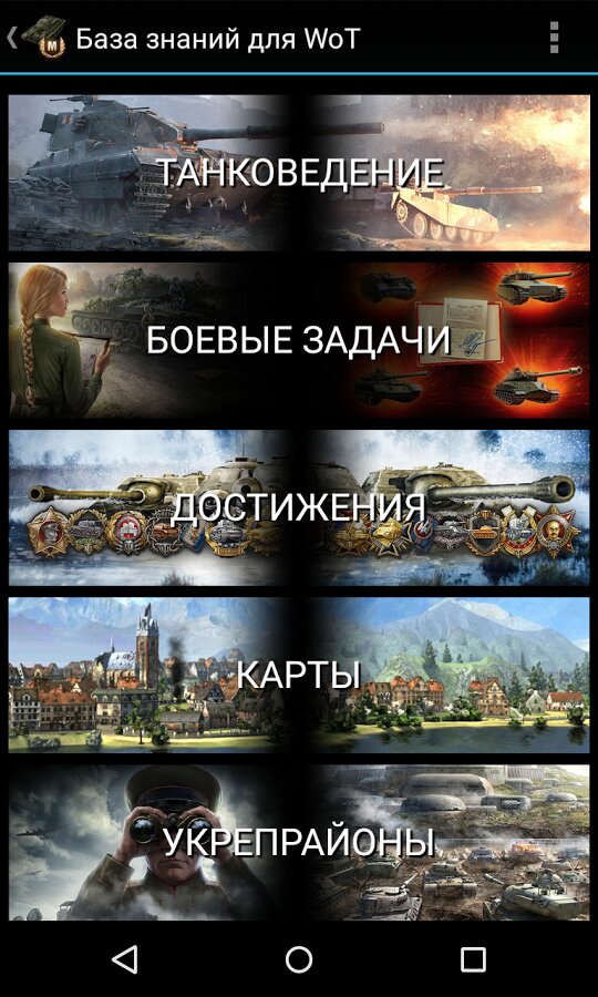 База знаний по World of Tanks — развернутая информация по танкам всех наций, характеристикам ходовых, радиостанций, двигателей, башен и орудий, совместимости дополнительного оборудования и расходных материалов. Включает в себя данные о премиумных и подарочных танках.