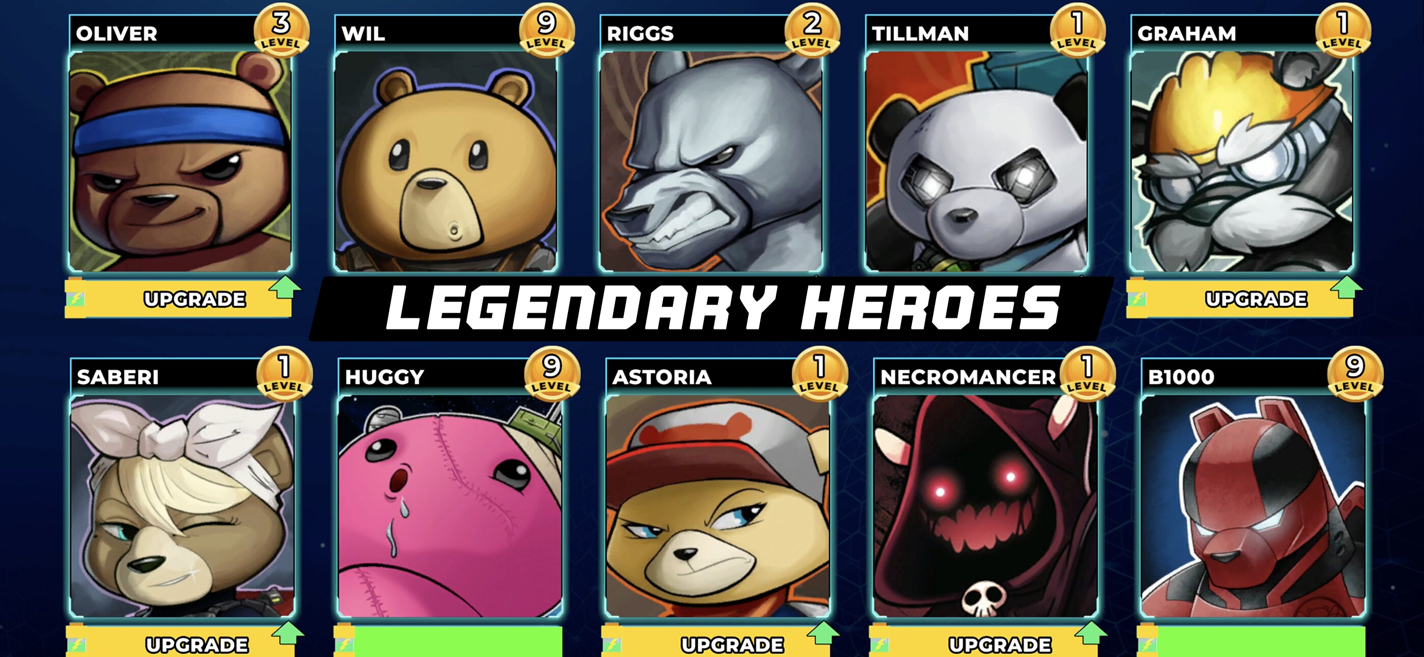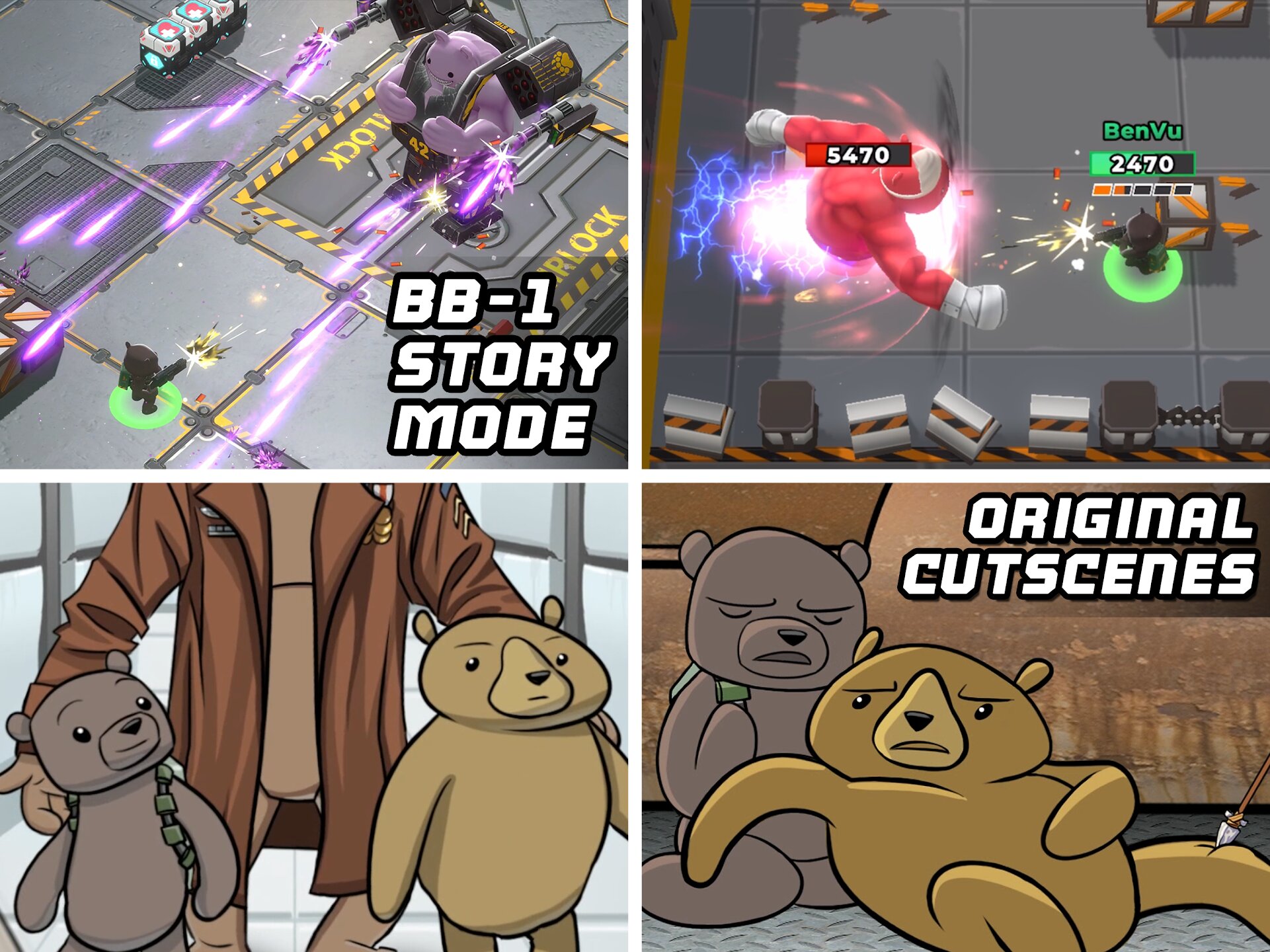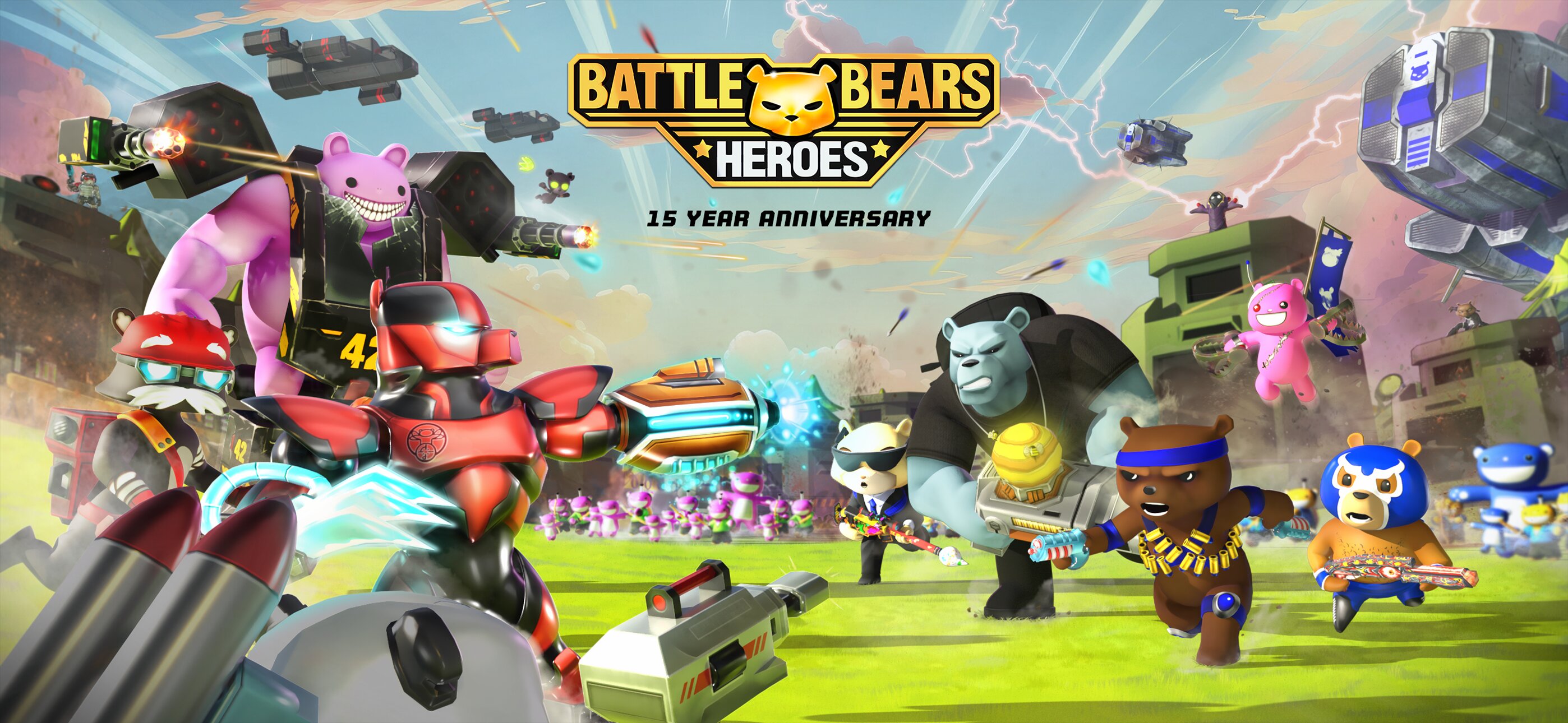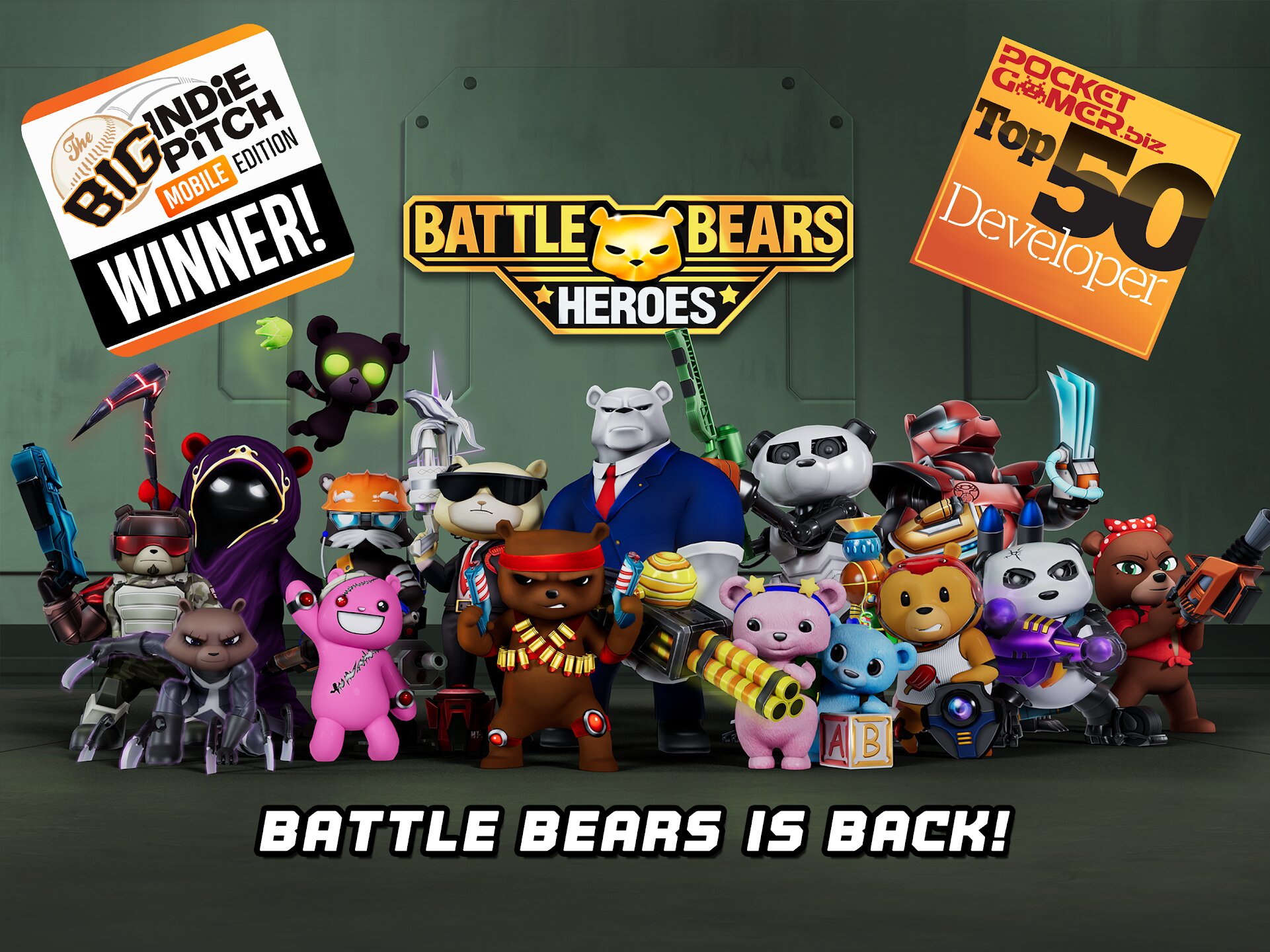 Разблокируйте и улучшайте обширный список культовых медведей, таких как Оливер, Риггс и Астория, каждый из которых имеет свою боевую роль. Настройте своих любимых героев с помощью уникальных скинов, заработанных в игре, в ежедневном магазине или в сезонном Golden Bear Battle Pass. Действие дополняется новым энергичным саундтреком Battle Bears и ремиксами классических треков, которые поддерживают адреналин во время каждого матча.