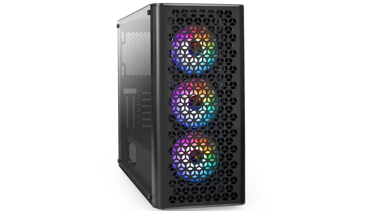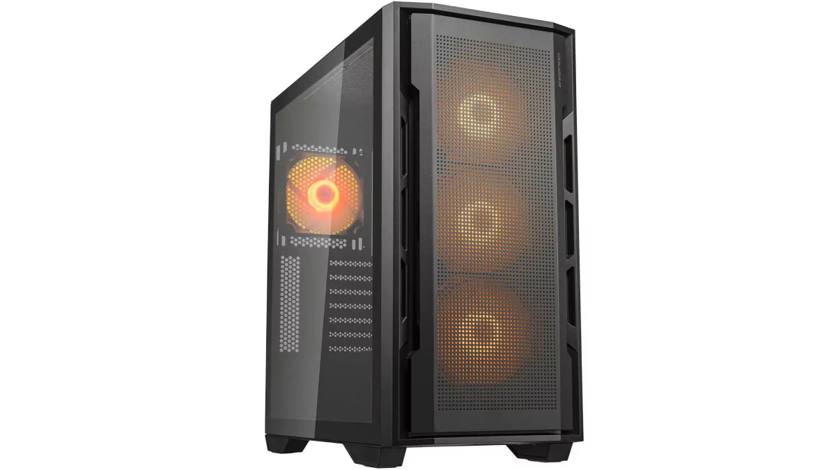 При выборе корпуса для данного ПК стоит обязательно учитывать длину видеокарты (338 мм) и высоту процессорного кулера (163 мм), чтобы затем не пришлось работать ножницами по металлу. И лучшим вариантом на российском рынке, который способен удовлетворить вышеуказанные требования, можно смело назвать Cougar Uniface X RGB V2. Внутри кейса помещается видеокарта до 400 мм, то есть буквально любая, а под процессорный кулер выделено 180 мм — это очень много пространства. Кроме того, модель поставляется с четырьмя предустановленными с завода вентиляторами по 140 мм, которые не только приятно светятся, но и создают мощный воздушный поток, продувающий всю систему. Существенное преимущество даже за эту цену.