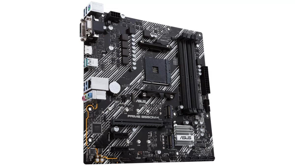 Фундаментом для недорогого компьютера выступит материнская плата ASUS PRIME B550M-K, которая при довольно разумной стоимости предлагает 4 слота под оперативную память, 7.1-канальный звук Realtek ALC887, гигабитную сетевую карту, крайне удобное расположение батарейки (её можно будет снимать даже без демонтажа видеокарты или процессорного кулера) и приличный набор портов для подключения периферии. Из минусов, правда, стоит отметить отсутствие порта USB Type-C — есть только USB Type-A. Также новичкам понравится интуитивно понятный BIOS материнской платы с современным интерфейсом — это полезно на тот случай, если пользователь решит сменить частоту оборотов вентиляторов или банально переустановить Windows.