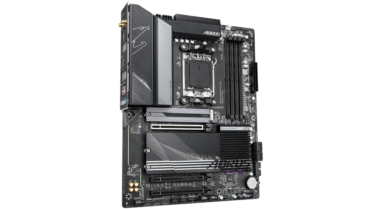 Собирать наиболее дорогой ПК в данной статье предлагаю на базе материнской платы GIGABYTE B650 AORUS ELITE AX V2 с довольно скромным дизайном — тренд на яркие RGB-элементы давно прошёл. Плата предоставляет четыре слота под ОЗУ, большие радиаторы из алюминия на цепях питания, усиленный порт под видеокарту и сразу два штатных радиатора для M.2-накопителей. Естественно, плата поддерживает AMD EXPO и Intel XMP, имеет сетевую карту на 2,5 Гбит/сек, встроенный модуль Wi-Fi (Wi-Fi 6) и 7.1-канальный звук. Эта плата была выбрана не просто так — она, одна из немногих в этом ценовом сегменте, поддерживает M.2-накопители с интерфейсом PCI-E 5.0, что крайне важно для максимальной скорости передачи информации.