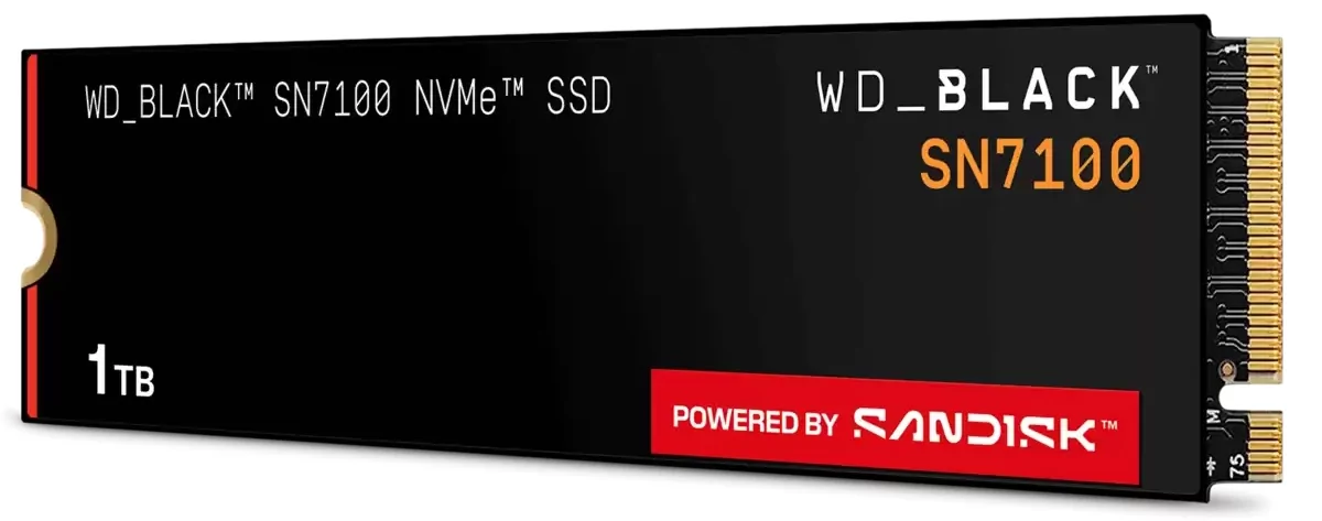 Пожалуй, лучшим твердотельным накопителем для данной сборки выступит модель WD Black SN7100 на 1 ТБ — он работает по интерфейсу PCI-E 4.0, предлагая до 7250 МБ/сек на чтение и до 6900 МБ/сек на запись. Безусловно, у всех разные потребности в объёме памяти, но подавляющему большинству геймеров 1 ТБ пространства будет вполне достаточно, чтобы хранить много игр, софта и прочего развлекательного контента. Также производитель заявляет о том, что эта модель благодаря TLC-памяти способна предоставить ресурс наработки на отказ до 600 ТБ — это впечатляющая «выносливость», которой могут похвастаться далеко не все конкуренты за аналогичную цену. И пусть вас не смущает отсутствие радиатора на SSD — он есть на мат. плате.