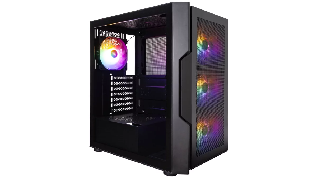 Среди корпусов, которые способны вместить башенный кулер высотой 158 мм, считаю наиболее привлекательным вариантом модель 1STPLAYER TRILOBITE T7-P. Да, производитель, безусловно, не самый известный, но у кейса достаточно преимуществ, чтобы на это можно было смело закрыть глаза. Во-первых, из коробки пользователь получает сразу четыре вентилятора с RGB-подсветкой и диаметром лопастей 120 мм — три расположены на фронтальной панели, сразу за перфорированной решёткой, а ещё один стоит на задней стенке. При этом внутри достаточно места под видеокарту длиной до 340 мм (у нас 247 мм — есть запас почти в 10 см), есть отдельный отсек для блока питания, а стеклянная панель закреплена безвинтовым способом.