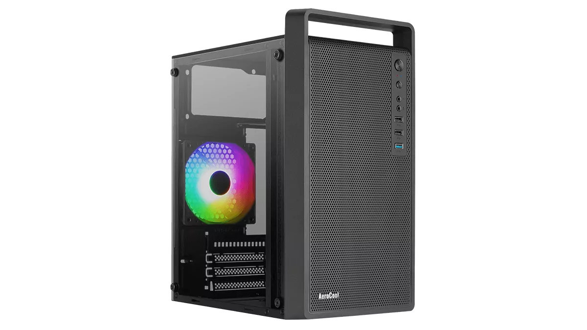 Собирать все вышеперечисленные компоненты системы предлагаю в довольно симпатичном корпусе AeroCool Cs-109, который стоит разумных денег и позволяет разместить видеокарту, процессорный кулер, материнскую плату и блок питания без какого-либо стеснения. Собственно, именно это я всегда ставлю на первое место — нужно всегда учитывать размеры базовых компонентов ПК, а уже потом смотреть на дизайн, какие-то фишки и особенности. Кроме того, корпус поставляется с предустановленным вентилятором на 120 мм, который стоит на задней стенке и выбрасывает наружу горячий воздух, а фронтальная панель представляет собой сплошную перфорацию с мелкой сеткой, мешающей прониканию пыли внутри корпуса.