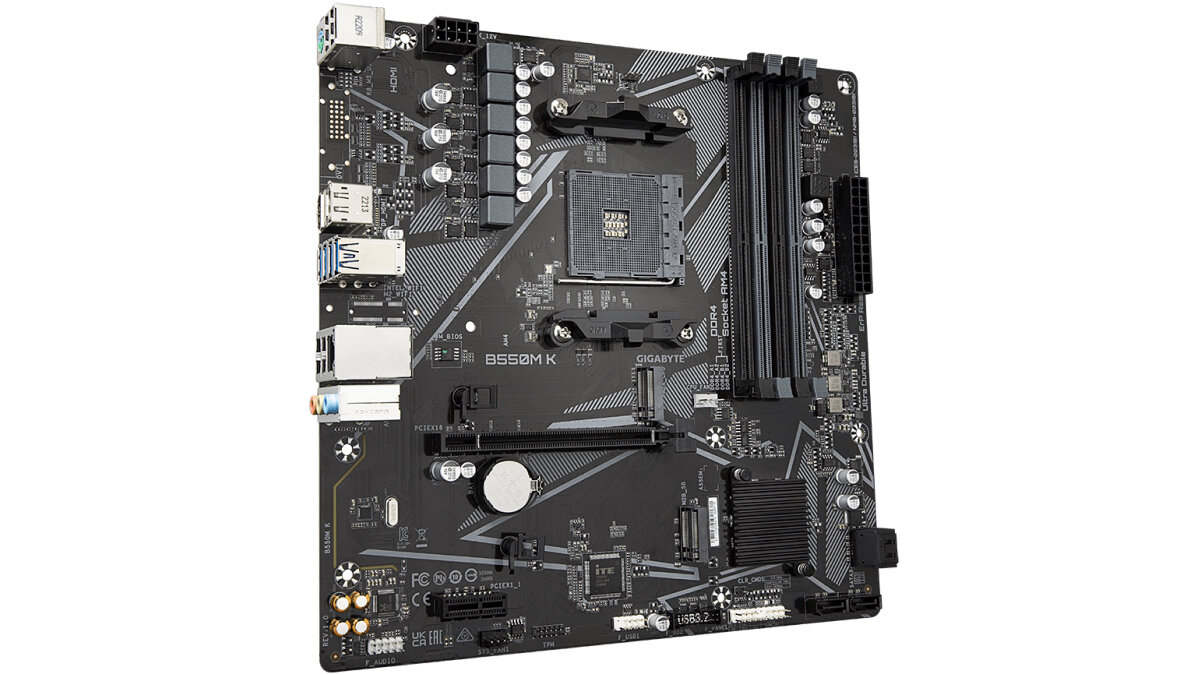 Собирать систему предлагаю на базе материнской платы Gigabyte B550M K, которая при сравнительно разумной стоимости (особенно на фоне плат на чипсете Intel из этого же ценового сегмента) предлагает приличный набор преимуществ. Например, здесь имеется четыре слота под оперативную память (у многих доступных плат на B450 всего два слота, как и у недорогих решений «синих»), достойная подсистема питания и сравнительно богатый набор портов для подключения всей базовой периферии. Кроме того, и это очень важный бонус, материнская плата продаётся с гарантией сроком 36 месяцев, тогда как у большинства конкурентов гарантия сроком всего один год. Это даёт некую дополнительную уверенность в завтрашнем дне.