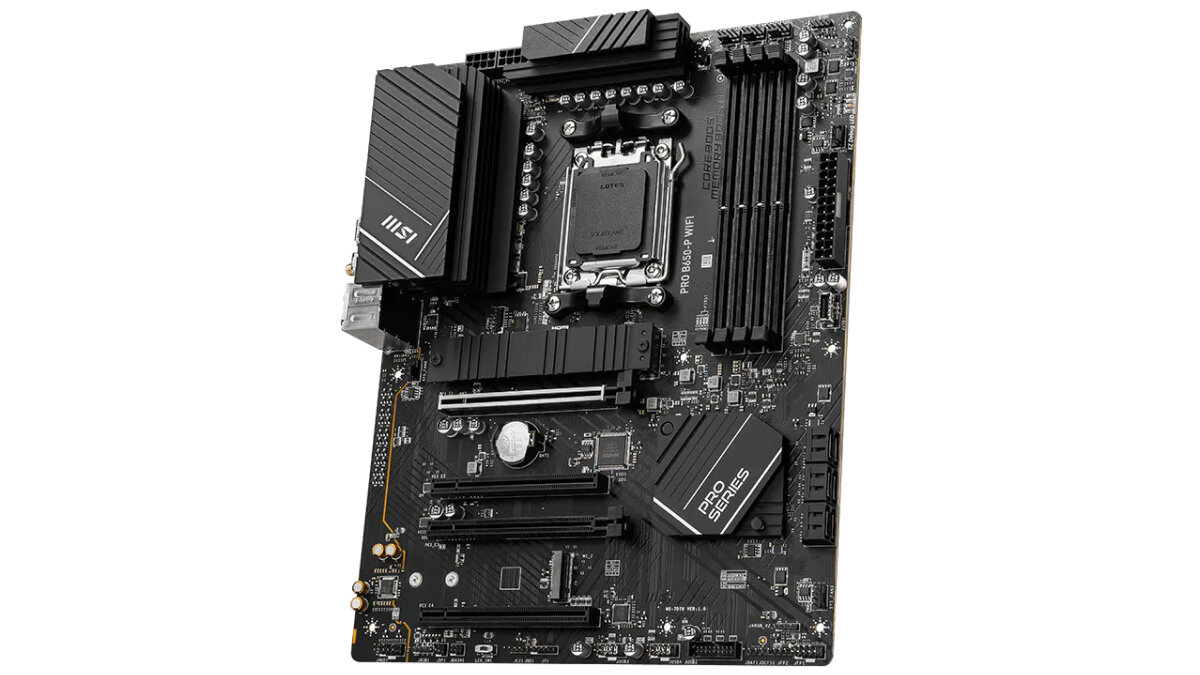 Формировать топовую игровую систему предлагаю на базе материнской платы MSI PRO B650-P WIFI, которая при более или менее разумной цене имеет всё необходимое и даже немного больше. Здесь, естественно, четыре слота под оперативную память, огромные радиаторы из алюминия на цепях питания, усиленный порт под видеокарту, отличное встроенное аудио, богатый набор портов, встроенный модуль Wi-Fi, а также имеется штатный радиатор для твердотельного накопителя. И он нам понадобится, так как SSD в этой сборке поставляется с не шибко большим радиатором, возможностей которого будет недостаточно. А ещё здесь довольно свежий BIOS с поддержкой Easy Mode — упрощённого режима с базовыми настройками для новичков.