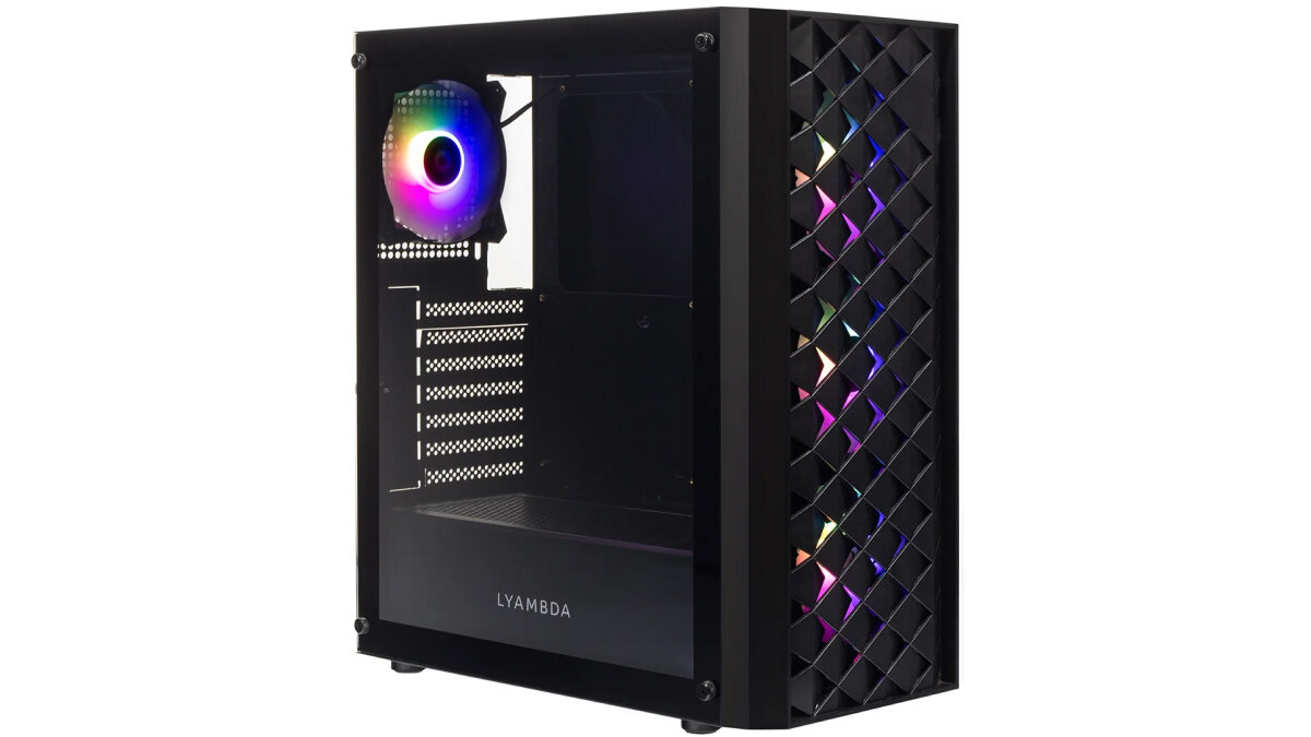Под требования текущей системы отлично подходит компьютерный корпус Lyambda LGT-03 — безусловно, это не самый известный в стране бренд, но, судя по отзывам реальных владельцев, качество сборки у компании на высоте. Кроме того, корпус поставляется с четырьмя предустановленными вентиляторами по 120 мм каждый — три расположены на фронтальной панели (они работают на вдув), а последний стоит на задней стенке (он выдувает из корпуса горячий воздух). Также здесь имеется стеклянная панель, сквозь которую можно наблюдать за компонентами системы, перфорированная лицевая сторона с интересным рисунком из ромбов, а также большой отдельный отсек для блока питания и всех кабелей, которые не хочется видеть под стеклом.
