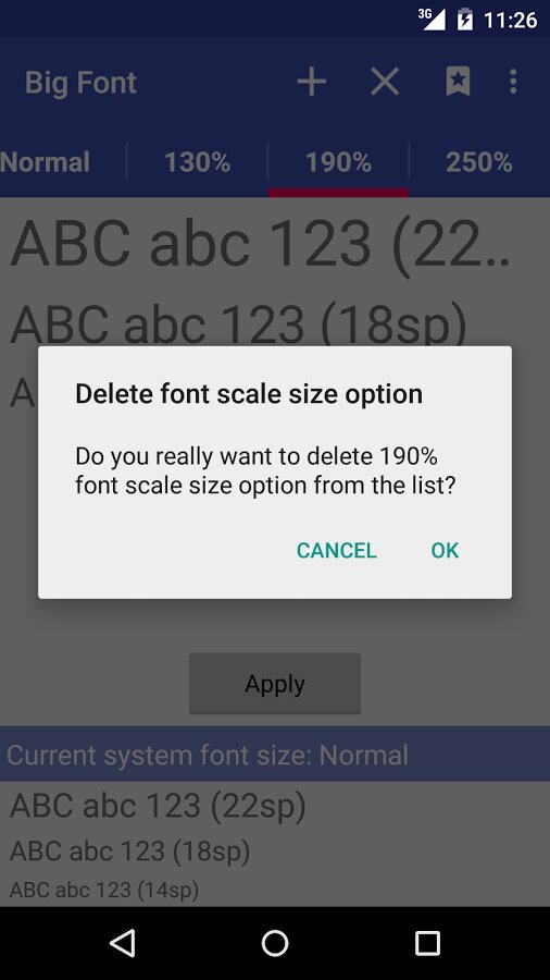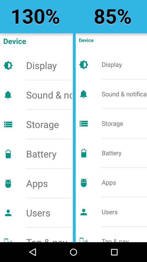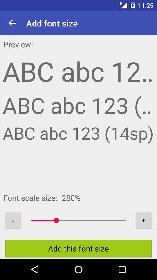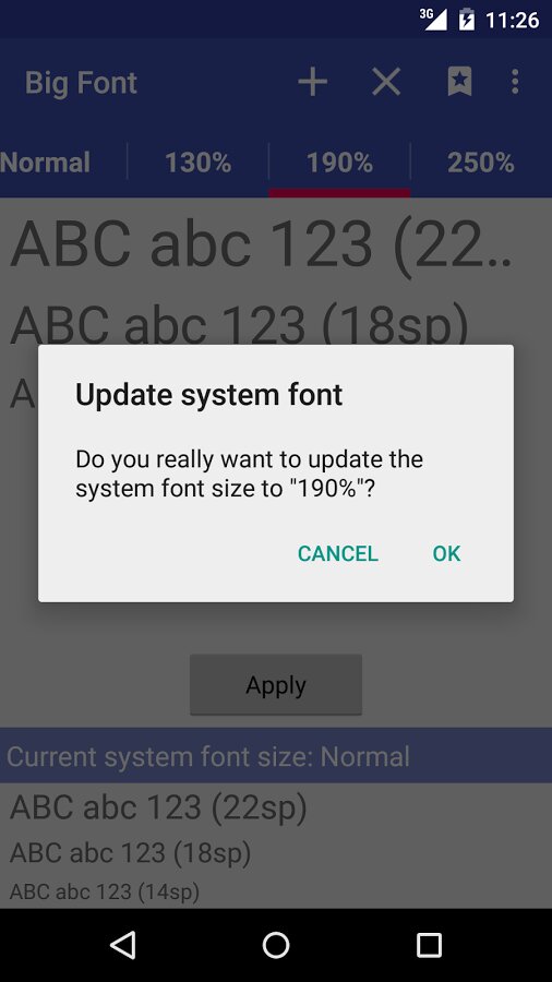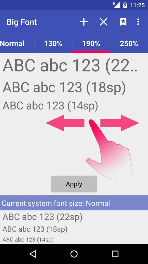 Big Font - позволит владельцам Android устройств сохранить свое зрение и улучшить читаемость при помощи увеличения шрифта. Пользователи с легкостью смогут изменять размер шрифта в диапазоне 50% — 300% от номинального значения. Программа позволяет просматривать результат до применения, что значительно упрощает процесс подборки оптимального решения. Значок уведомления отображает текущий размер шрифта и позволяет выключать изменение. На некоторых устройствах может требоваться наличие ROOT-прав. Интерфейс приложения Big Font (change font size) симпатично выглядит, прост и удобен в пользовании.