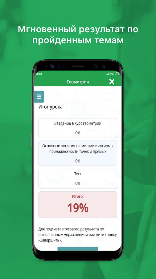- Результаты. В конце уроков предлагается итоговый тест для проверки полученных знаний. После решения всех упражнений и итогового теста можно посмотреть результат: процент правильности выполненных заданий.