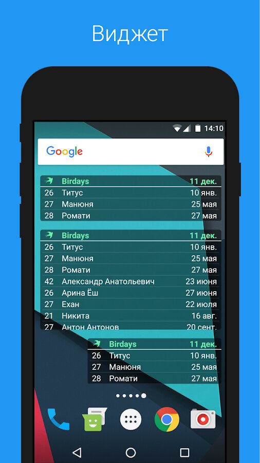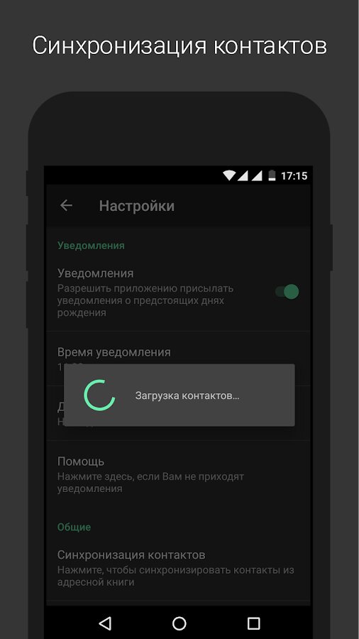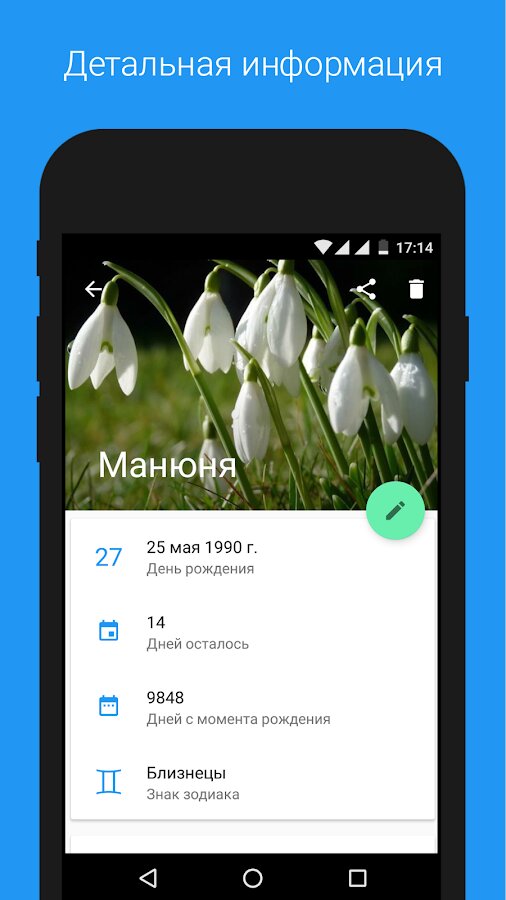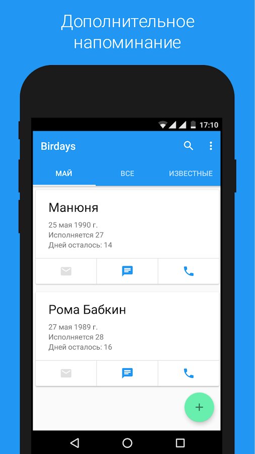 Интеграция со стандартными функциями телефона. Не выходя из приложения, Вы можете послать сообщение или email имениннику с наилучшими пожеланиями или просто позвонить. Также Вы можете установить дополнительное напоминание за несколько дней до дня рождения.