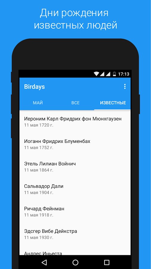 Узнайте, кто родился в Ваш день рождения! В приложении реализована база данных с днями рождения более, чем 2000 выдающихся ученых, гениев, художников, актеров, музыкантов и других знаменитых людей. Узнайте, кто родился сегодня или в Ваш день рождения!