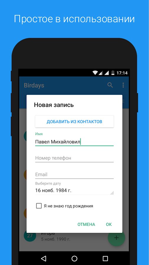 - Позволяет записывать только день и месяц, если не знаете год рождения