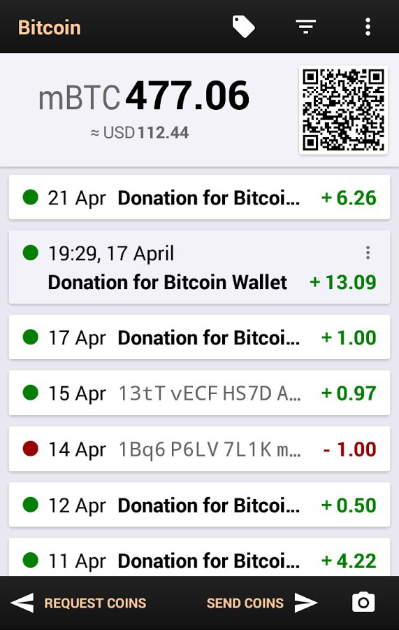 Bitcoin Wallet — это автономный кошелек для Android. Приложение позволяет Вам совершать финансовые операции. Имеет калькулятор конвертации валют, отображает ваш баланс не только в BTC, но и в указанной ему валюте. Особенности кошелька: ваши адреса bitcoin и закрытые ключи к ним хранятся в файле wallet.dat. Клиент предлагает возможность зашифровать файл с помощью пароля. У приложения есть русская версия.