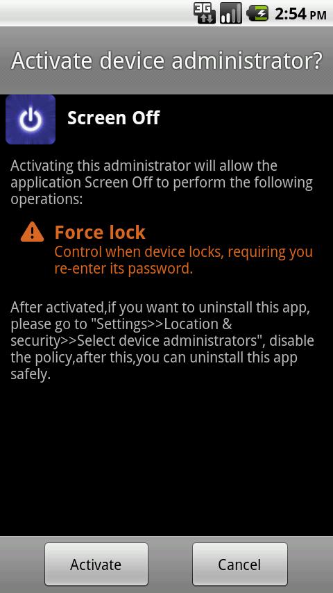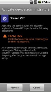 Это приложение использует адинистративную функцию на устройствах с Андроид 2.2 и с более поздними версями, поэтому Вы должны предварительно активировать эту функцию перед началом работы. **ПРАВА РУТ НЕ ТРЕБУЮТСЯ!**