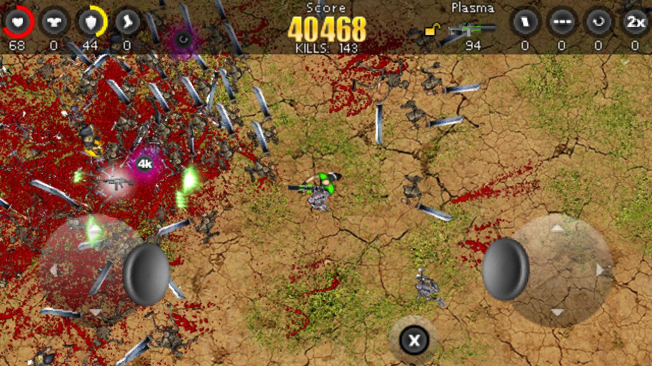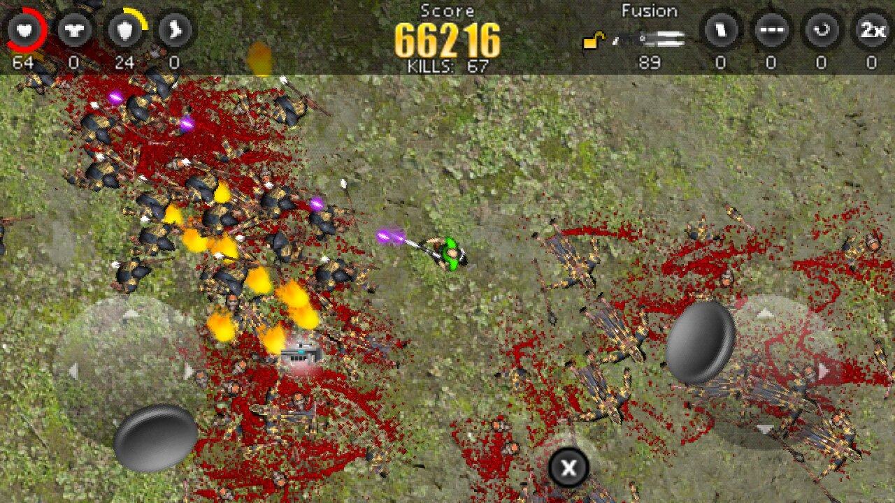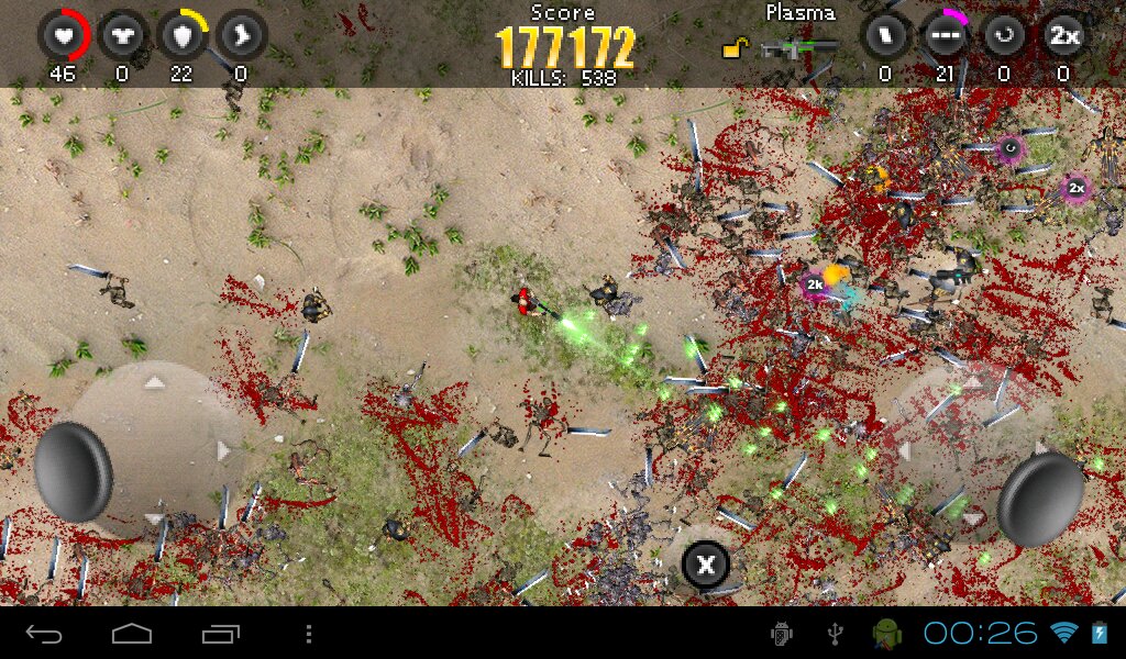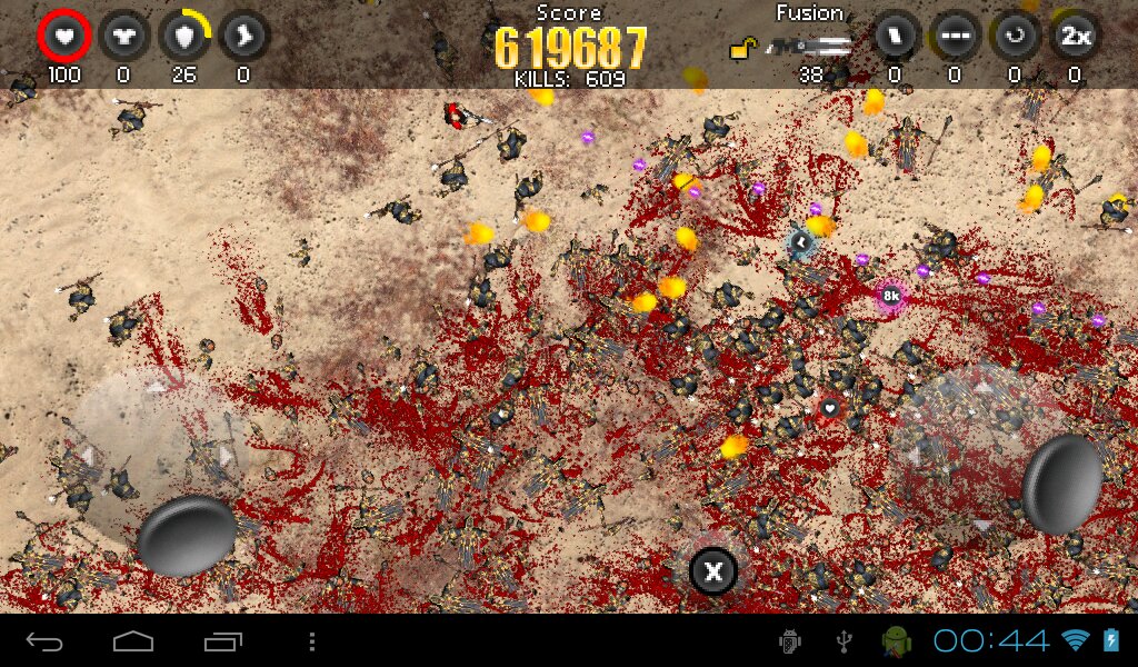 Blood ‘n Guns — игра наполнена многочисленными зомби, в которых нужно стрелять и убивать. Вы подвергаетесь постоянным атакам войска зомби на фоне самых разнообразных локаций. Все 12 уровней вы будете находиться в предвкушении долгожданной победы над врагами. При помощи специальной опции можно будет сохранять игру в том месте, где вы ее закончили, независимо от того, прошли вы уровень или нет.Вам понравятся фоны игры, которые постоянно меняются. Графика игры сделана довольно качественно, поэтому, вы будете получать несравненное удовольствие от игры. В каждой битве будет насчитываться около 80 зомби, причем, когда вы будете их убивать, трупы будут оставаться в локации, и не будут исчезать. Для того, чтобы взорвать орду зомби вам потребуется мощная пушка и динамит. Применяя каждый раз оружие вы будете слышать реалистичные звуки взрывов. Всего вашему вниманию будет представлено 12 пушек, 4 оружия бесперебойного питания. Игроки будут защищены доспехами и щитами. Каждый ваш персонаж будет обладать определенной скоростью бега.С каждым уровнем вам нужно будет бороться с еще большим числом зомби, поэтому, используйте оружие и защищайтесь, чтобы продлить себе жизненные силы. В игру Blood ‘n Guns на Андроид вы можете загрузить любимые треки, чтобы убивать зомби под любимую музыку.