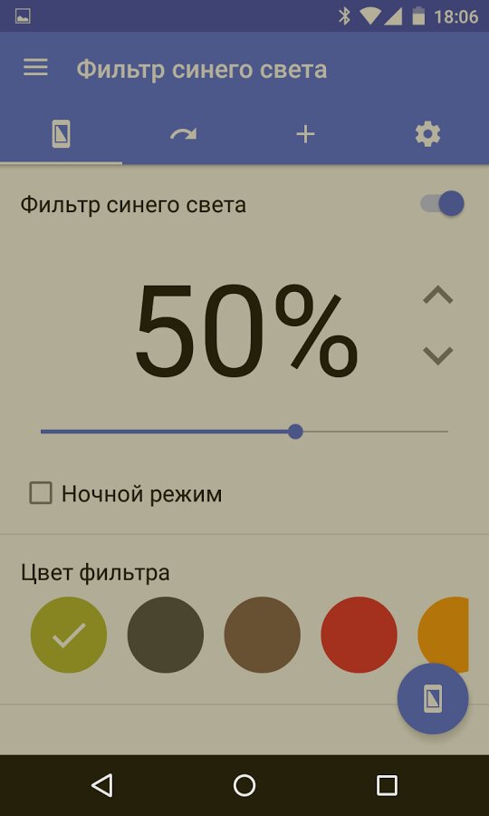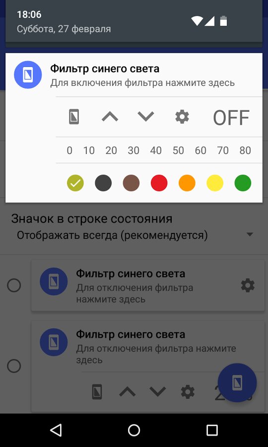 Фильтр синего света — для Android снижает до минимума синий цвет на экране вашего девайса, что позволяет значительно уменьшить утомление глаз. Программа является очень простой в использовании: вам всего лишь нужно его включить перед тем, как начнете читать или просматривать Веб-сайты с большим количеством текстовых материалов. В панели уведомлений же появится ярлык, обозначающий, что фильтр включен, а при нажатии на него происходит деактивация и экран возвращается в нормальное состояние. Кроме этого, в приложении можно выбрать иной цветовой фильтр, а также настроить непрозрачность каждого из них.