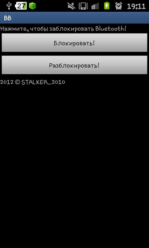 Bluetooth Blocker — программа разработана для случаев, когда надо показать, что BlueTooth «заглючил». Не является вирусом, т.к. запускается владельцем смартфона. Разработано за 10 минут только для личного пользования, но потом выложено сюда. Интерфейс простейший, он в этой программе и не нужен. После блокировки не забудьте разблокировать.