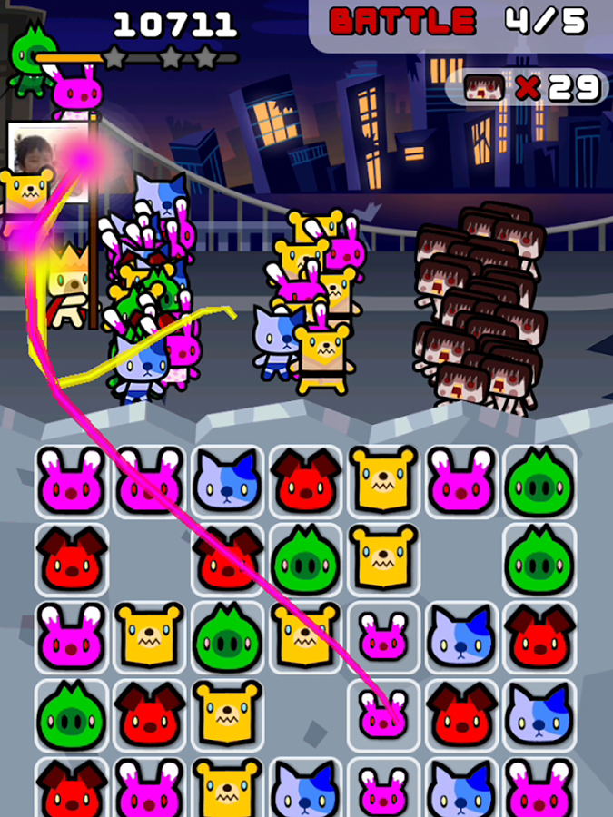 Экран разделен на две части. В нижней находится привычное разноцветное игровое поле, состоящее из мордашек щенков, котят, кроликов и других милых животных. Когда три и больше зверька поставлены в ряд, они появляются в верхней части экрана, где их уже ждет отряд мертвецов. Обе команды сталкиваются в смертельной схватке. Нам нельзя пропускать трупы к полководцу звериного войска, поэтому приходится выдумывать стратегию ведения боя, ведь некоторых зомби можно победить только животными определенного цвета.