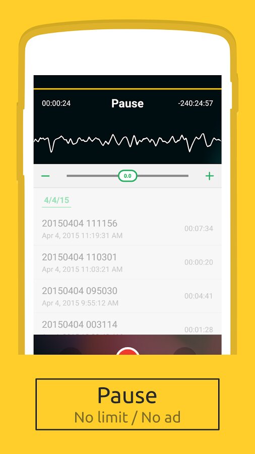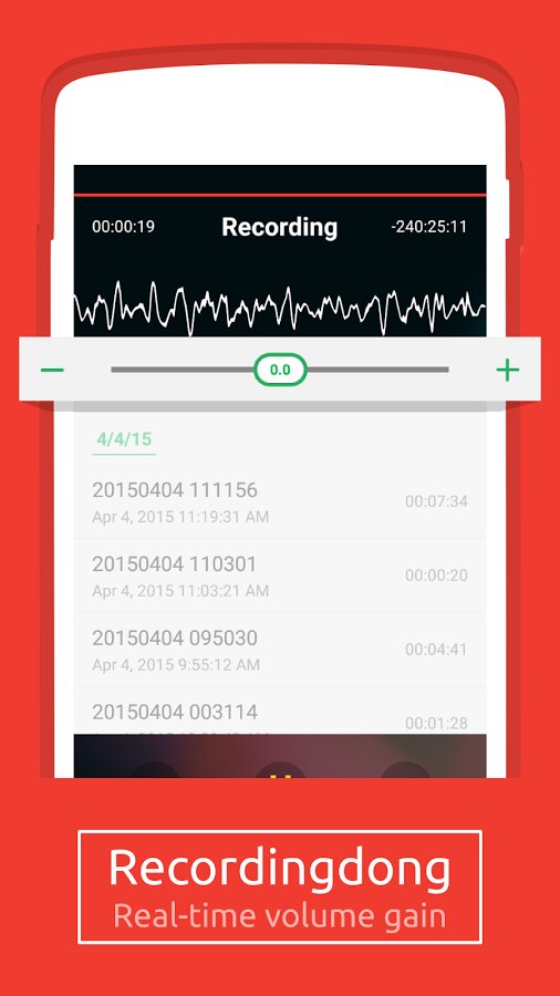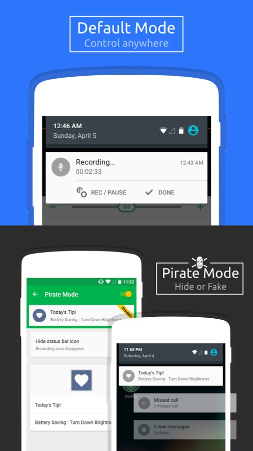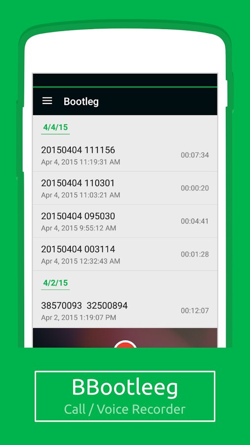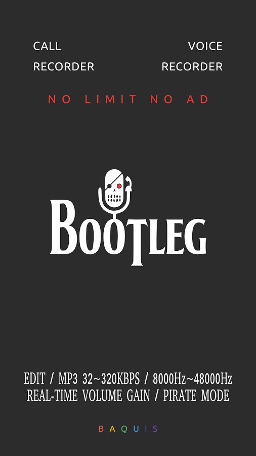 Bootleg — один из лучших диктофонов, выполненный в Material дизайне. Превосходное качество записи. Поддерживает запись только в mp3. Имеет множество настроек звука, в том числе усиление микрофона.