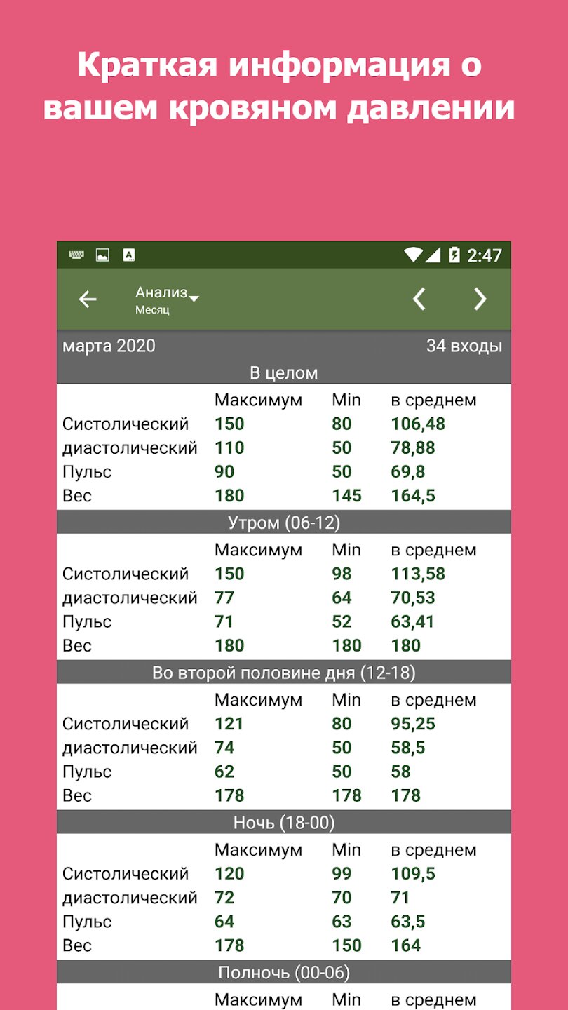 ★ Максимальные, минимальные и средние показатели артериального давления в виде сводных данных