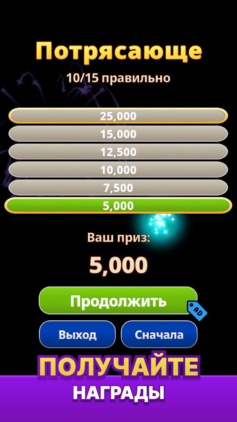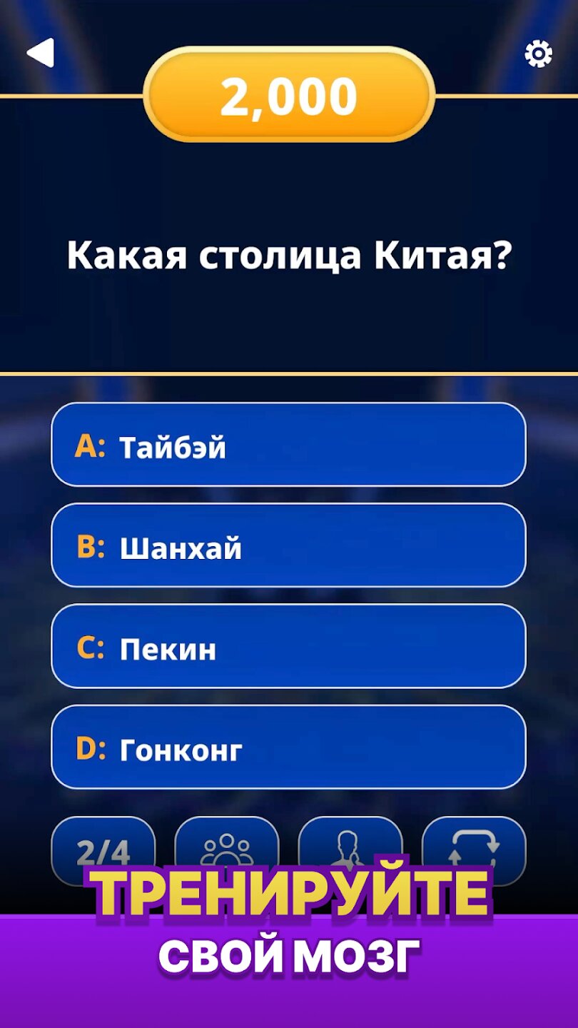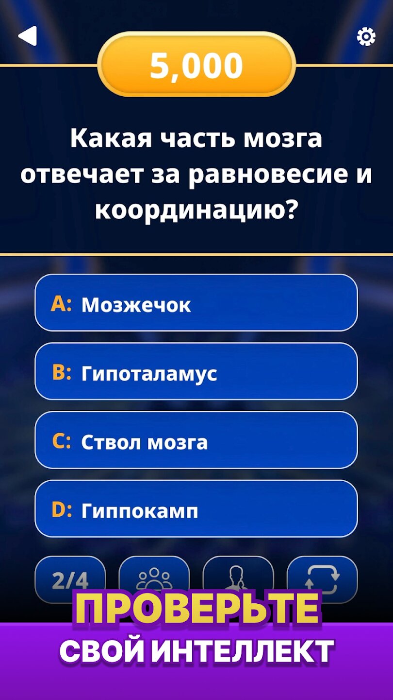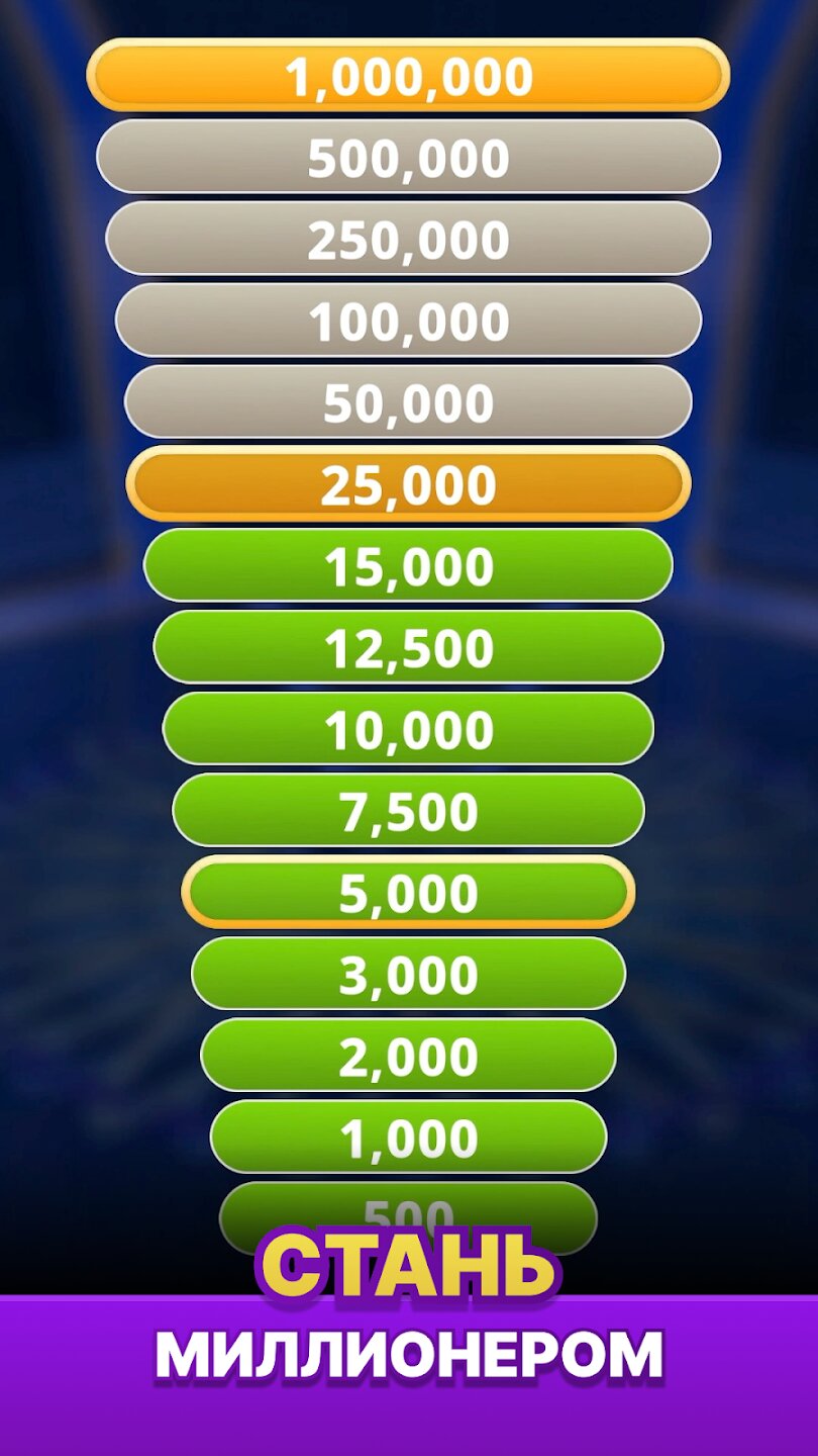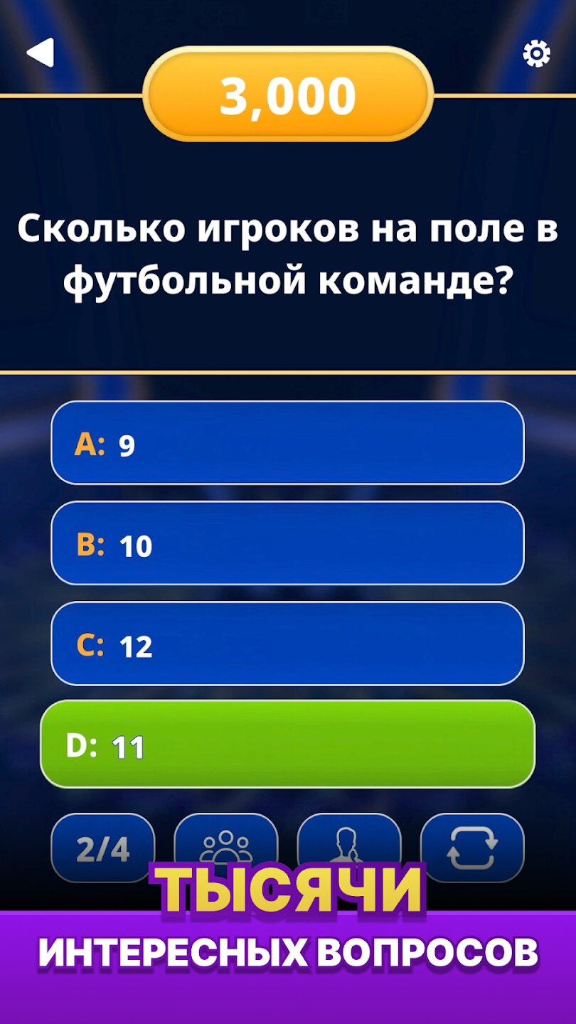 Игра проходит в классическом формате: четыре возможных ответа, только один правильный. Вы начинаете с более простых вопросов и продвигаетесь к все более сложным. В вашем распоряжении четыре подсказки — 50:50, Поменять вопрос, Позвонить другу и Спросить зрителей — каждая из которых требует стратегического выбора момента, чтобы максимизировать ваши шансы. Правильные ответы приближают вас к главном призу, который открывает коллекции и новые игровые локации для исследования. Элегантный дизайн и удобный интерфейс позволяют вам полностью погрузиться в погоню за богатством.