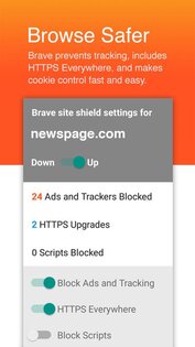 - БЫСТРЫЙ И БЕЗОПАСНЫЙ. Никаких внешних плагинов или настроек, которыми необходимо управлять или задавать! Браузер Brave просто предоставляет Вам самую быструю и безопасную систему поиска и просмотра информации в сети, доступную для Android. В основе Brave лежит скорость и безопасность, чтобы Вы могли наслаждаться молниеносным поиском в сети без всплывающих окон, вредоносных программ и других помех.