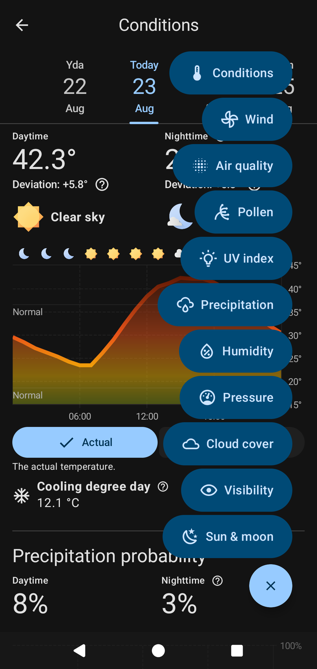 Breezy Weather предоставляет невероятно подробные метеорологические данные из более чем пятидесяти надежных источников по всему миру. Вы можете получить доступ ко всему: от стандартных почасовых и 16-дневных прогнозов до специализированной информации о качестве воздуха, уровне пыльцы и УФ-индексе. Приложение представляет эти данные в виде красивых анимированных диаграмм и выразительных блоков с подходящей цветовой гаммой, которые адаптируются к теме вашего телефона. Благодаря оповещениям о суровых погодных условиях и прогнозам осадков вы всегда будете готовы к тому, что приготовило для вас небо.