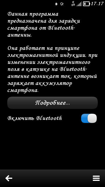 BTCharger — программа для зарядки смартфона от рассеянных в пространстве электромагнитных волн. Работает на принципе электромагнитной индукции, так же как разработки немецких ученых, однако вместо специального устройства, программа использует катушку вмонтированную в Bluetooth-антенну, что позволяет, используя низкоуровневые API системы перенаправить ток, образующийся в катушке, при изменении электромагнитного поля на зарядку аккумулятора смартфона.