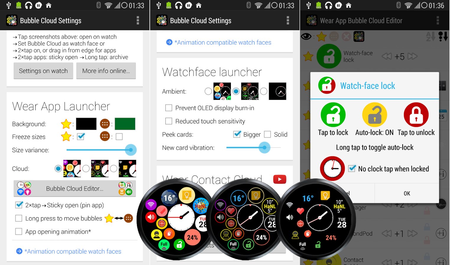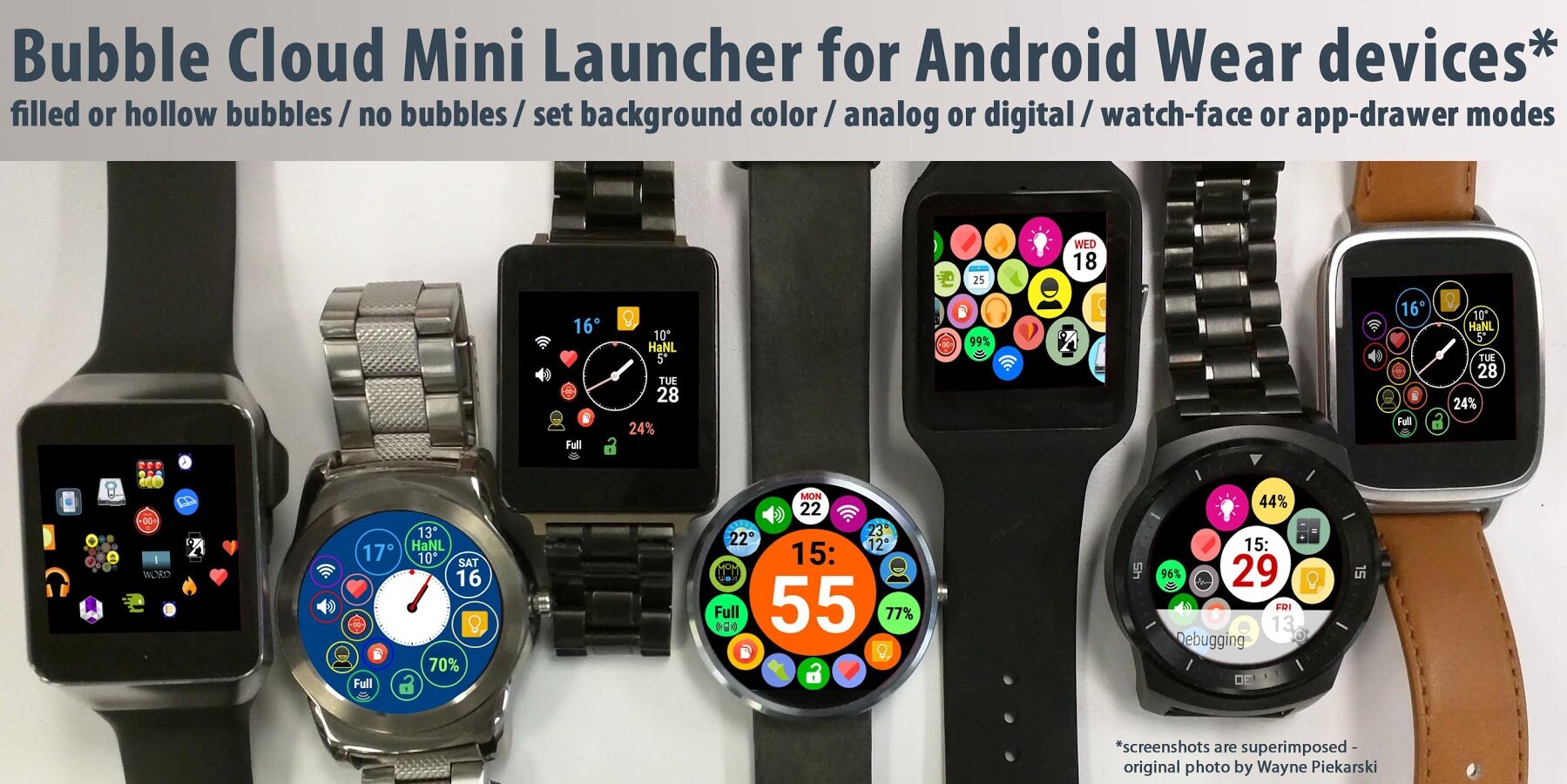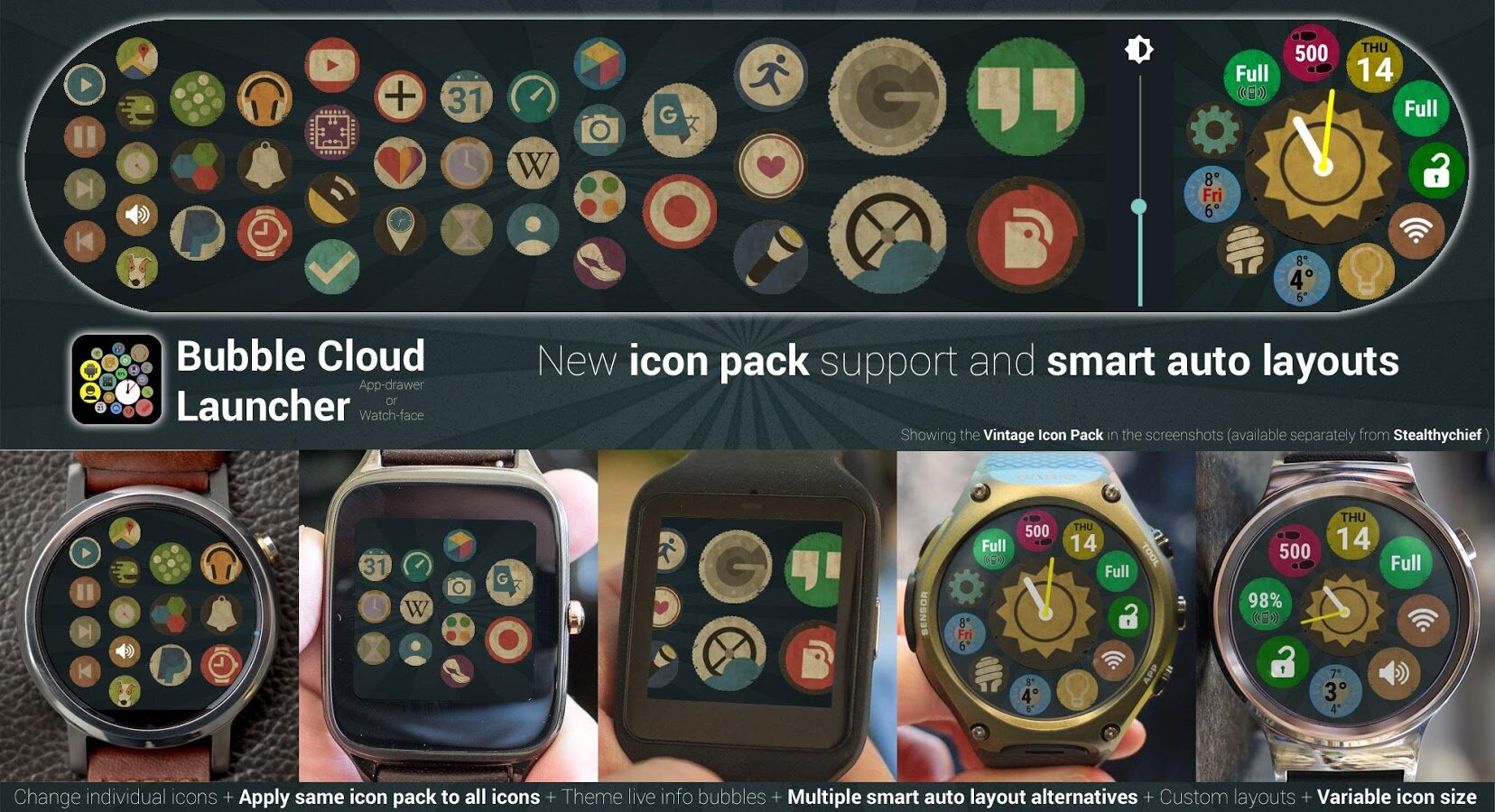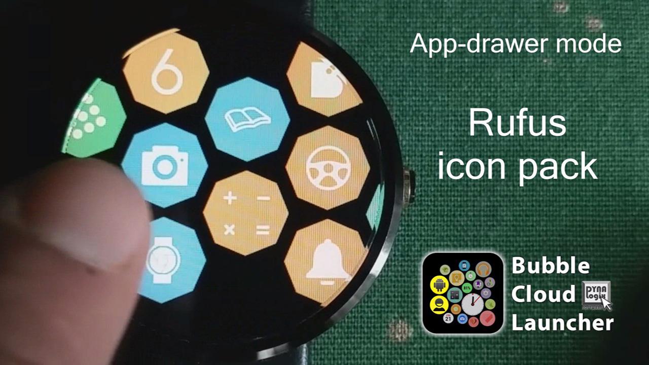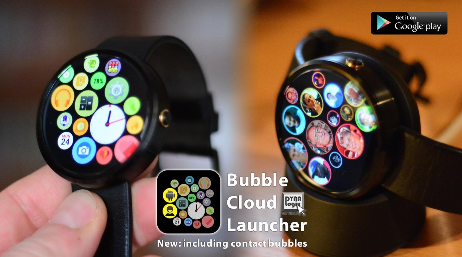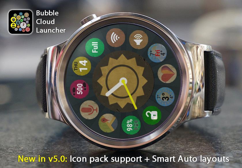 Bubble Cloud Widgets Wear — позволяет установить в качестве главного экрана на часах с Android Wear некое подобие интерфейса Apple Watch — иконки получают круглое обрамление, а также становятся в беспорядочное положение. К каждой иконке обрамление подбирается в соответствии с цветовой значка, поэтому все ссылки на приложения выглядят приятно и симпатично. Иконки можно перетаскивать с места на место, а также менять их размер, но у Bubble Cloud Widgets + Wear есть один большой минус — отсутствие тех самых анимаций, которые захватывают дух в Apple Watch.