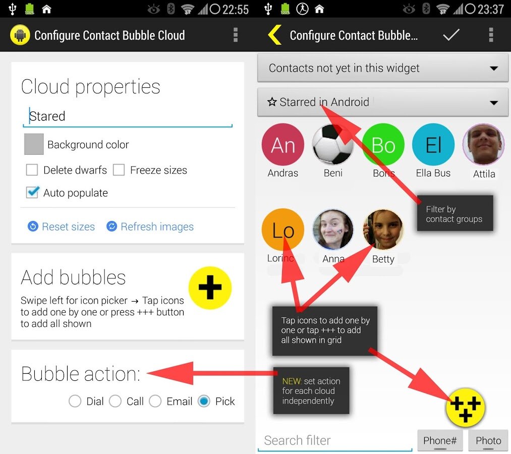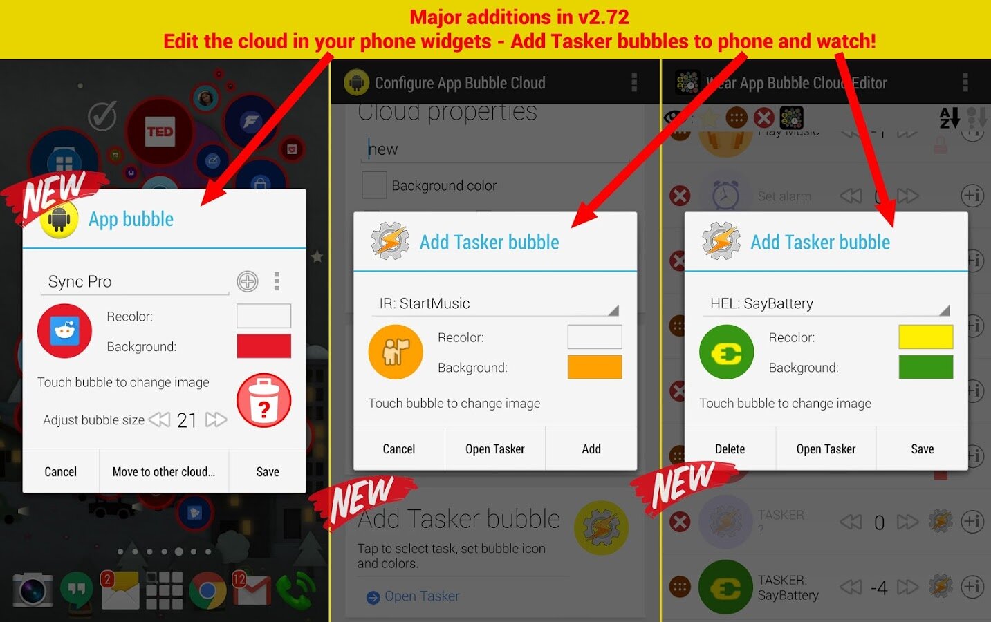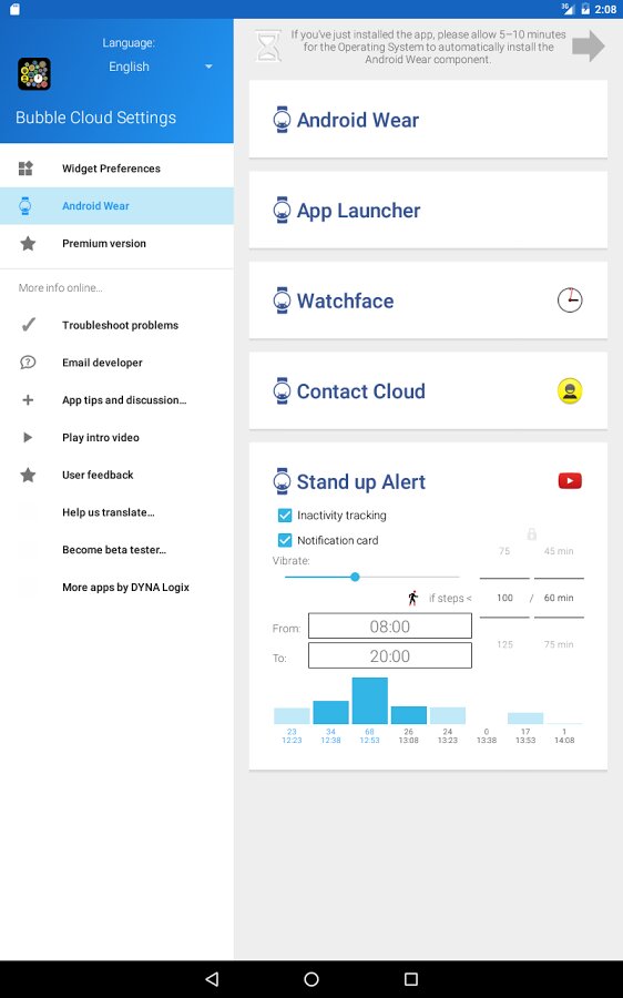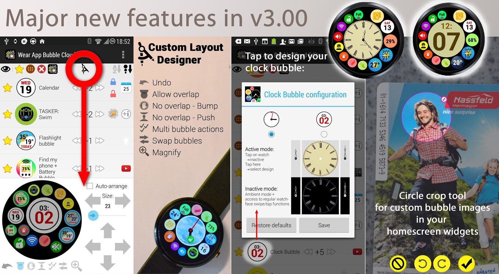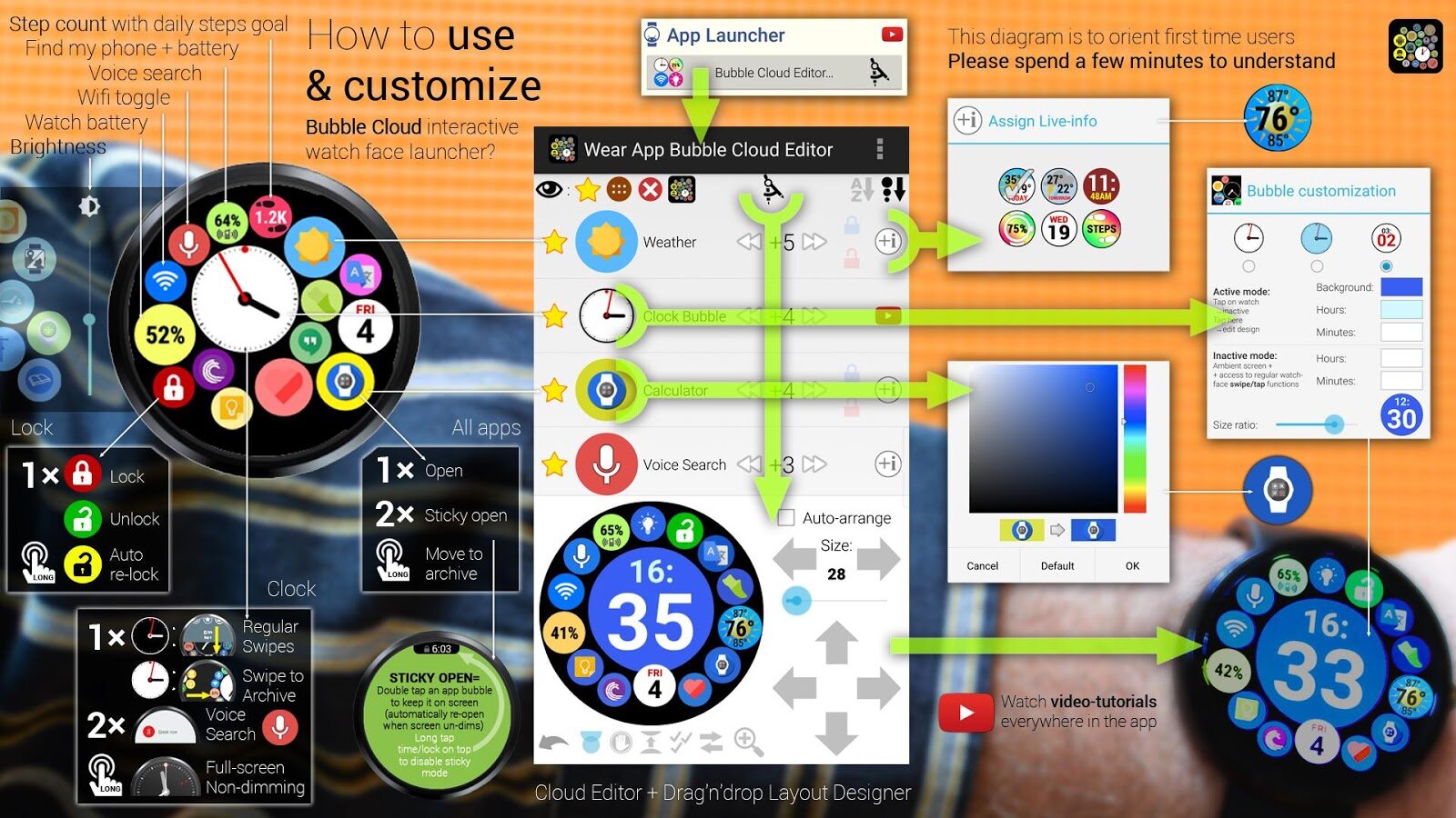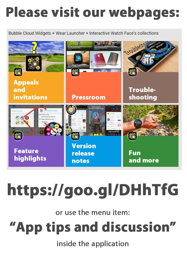 Bubble Cloud Widgets Wear — позволяет установить в качестве главного экрана на часах с Android Wear некое подобие интерфейса Apple Watch — иконки получают круглое обрамление, а также становятся в беспорядочное положение. К каждой иконке обрамление подбирается в соответствии с цветовой значка, поэтому все ссылки на приложения выглядят приятно и симпатично. Иконки можно перетаскивать с места на место, а также менять их размер, но у Bubble Cloud Widgets + Wear есть один большой минус — отсутствие тех самых анимаций, которые захватывают дух в Apple Watch.
