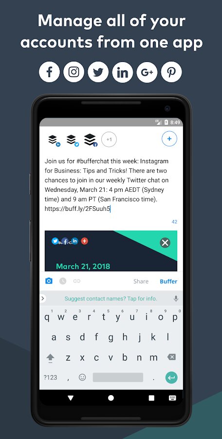 Buffer — это приложение для планирования и автоматизации публикаций в социальных сетях. Оно позволяет создавать расписание публикаций, добавлять контент и опубликовать его в различных социальных сетях, таких как Facebook*, Twitter, LinkedIn, Instagram* и другие. Buffer помогает сохранять постоянный контакт с вашей аудиторией, повышать ее узнаваемость и увеличивать количество подписчиков.
