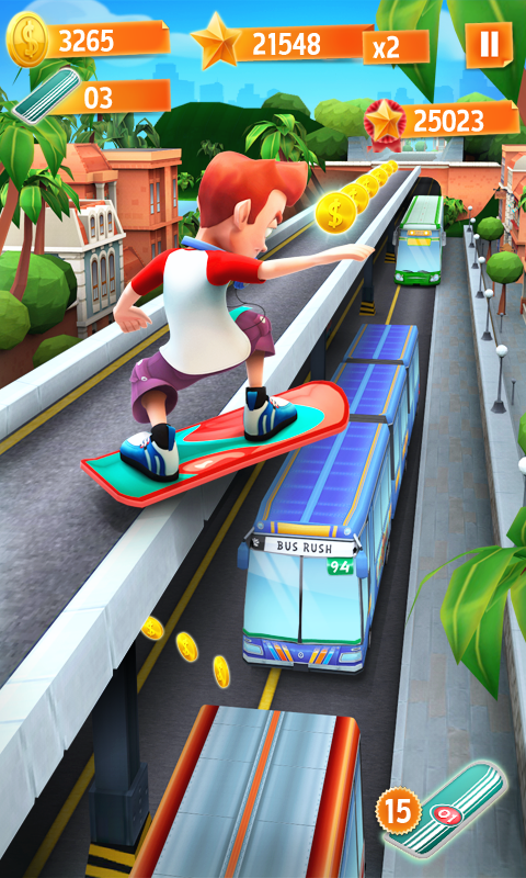 Bus Rush — это захватывающая бесконечная игра-бегалка, в которой вы должны перемещаться по оживленным городским улицам, уворачиваясь от препятствий и собирая монеты, чтобы заработать как можно больше очков. Как следует из названия, вам предстоит бежать по верху скоростного автобуса, перепрыгивая через барьеры и уворачиваясь от низко висящих препятствий. Благодаря интуитивно понятному управлению и быстрому игровому процессу Bus Rush идеально подходит для тех, кто ищет быстрых и захватывающих игр.
