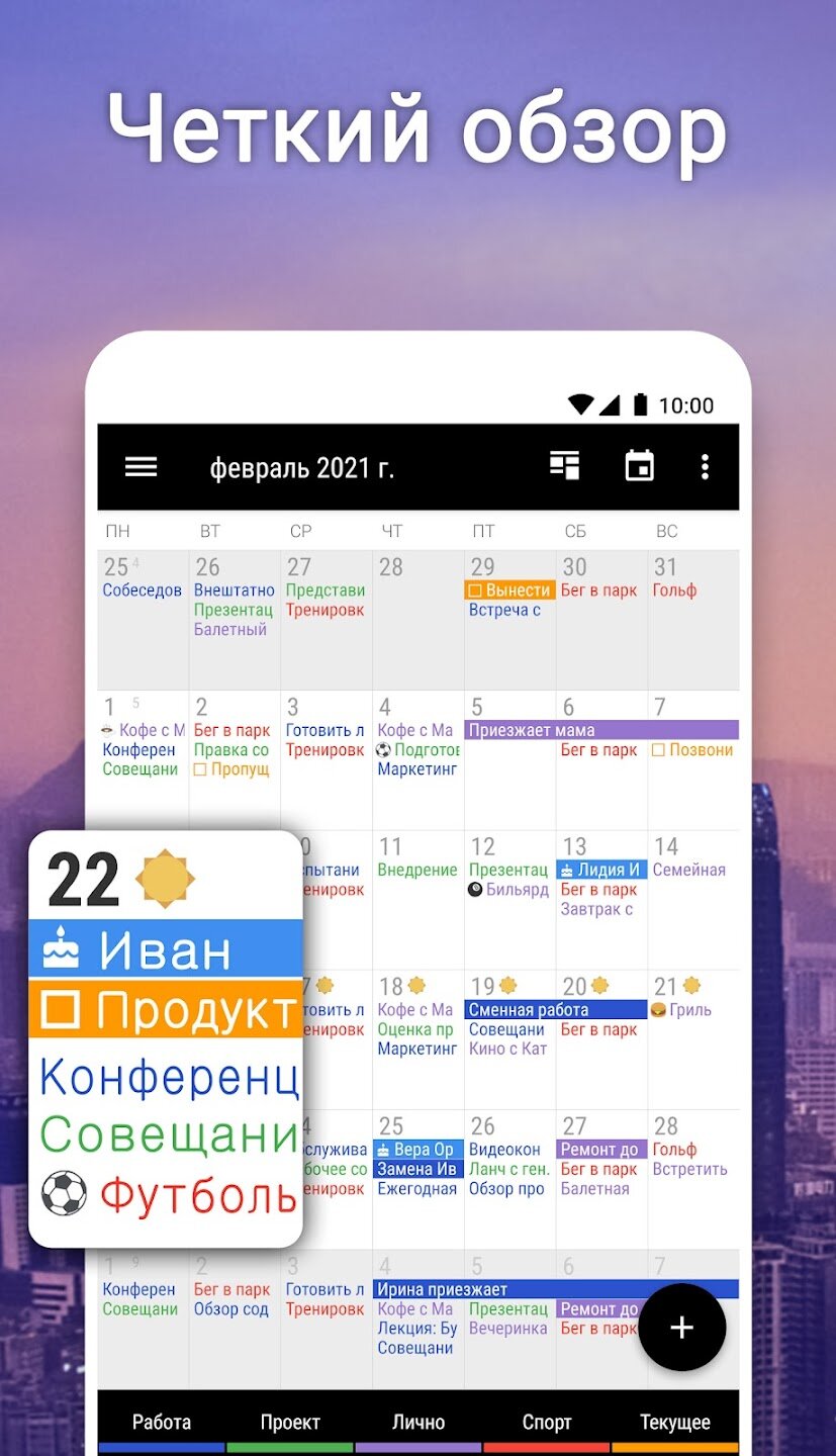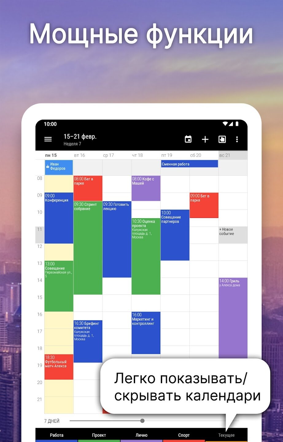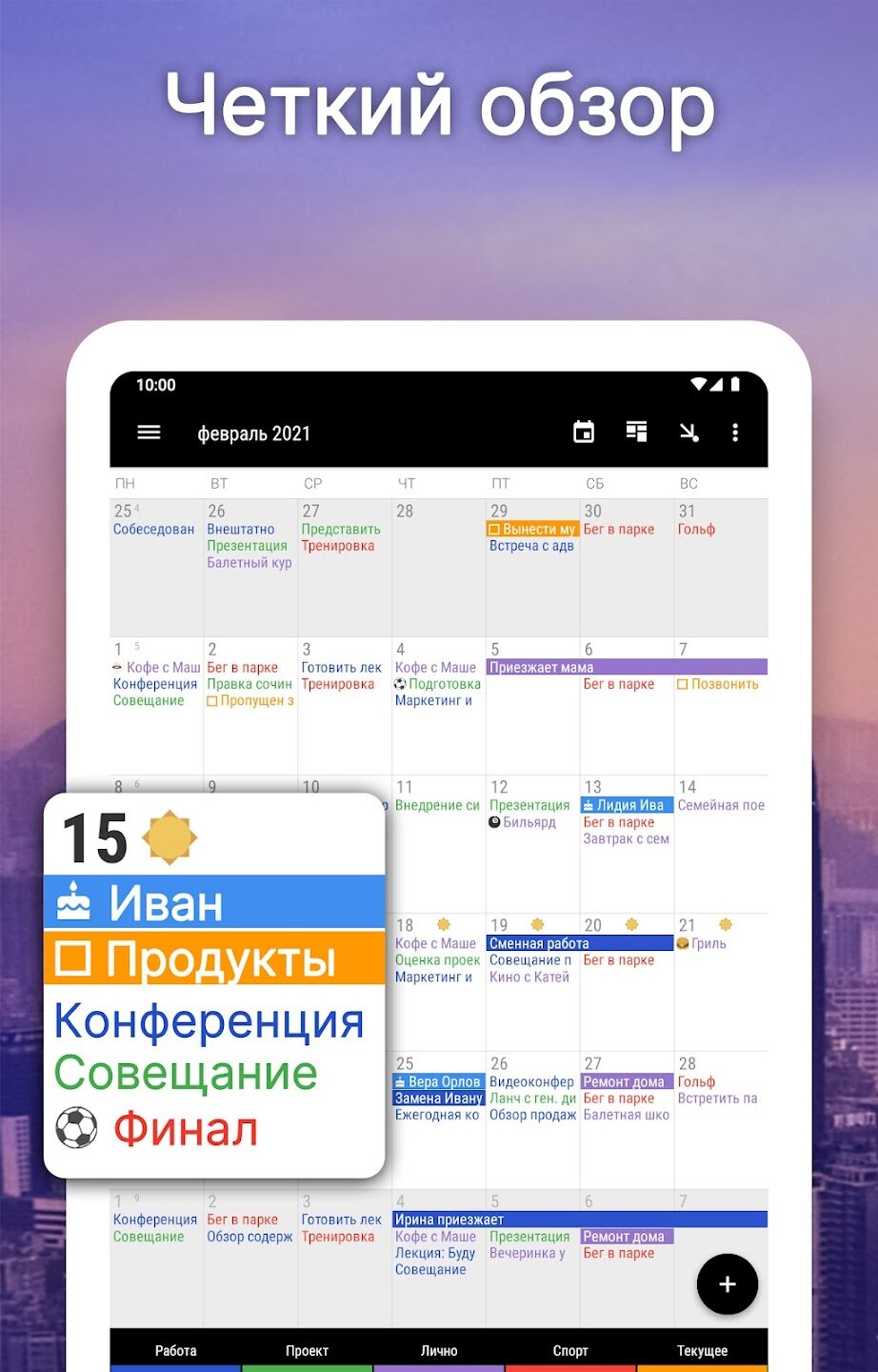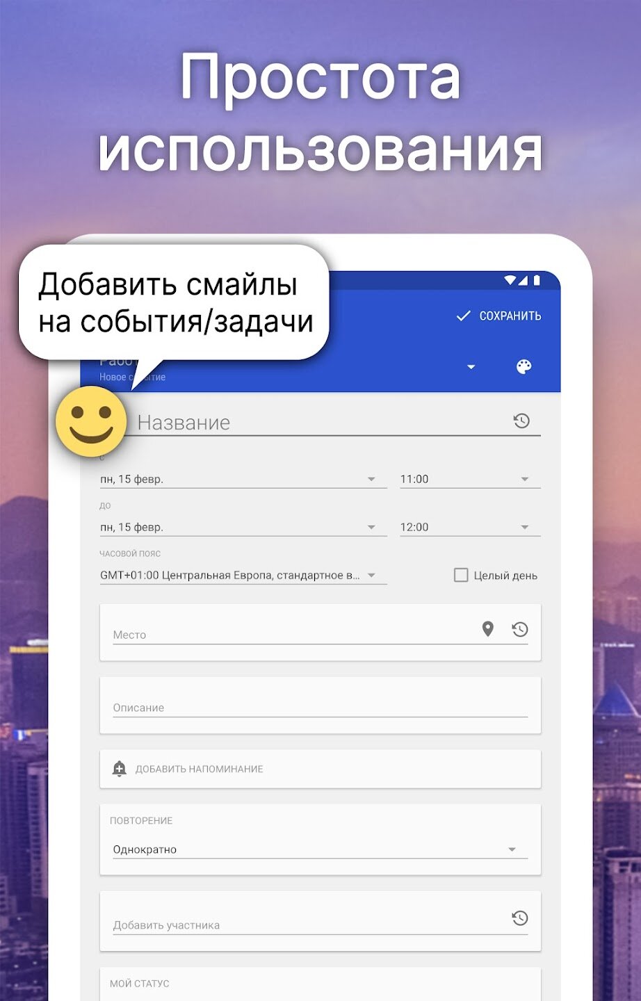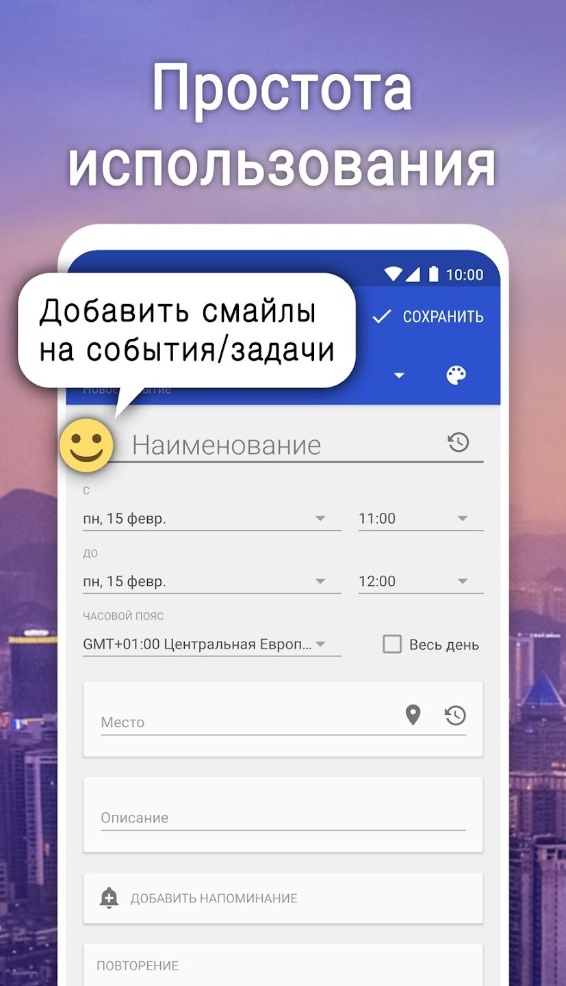 - Интеллектуальный ввод событий с предложениями и гибкими шаблонами повторения.