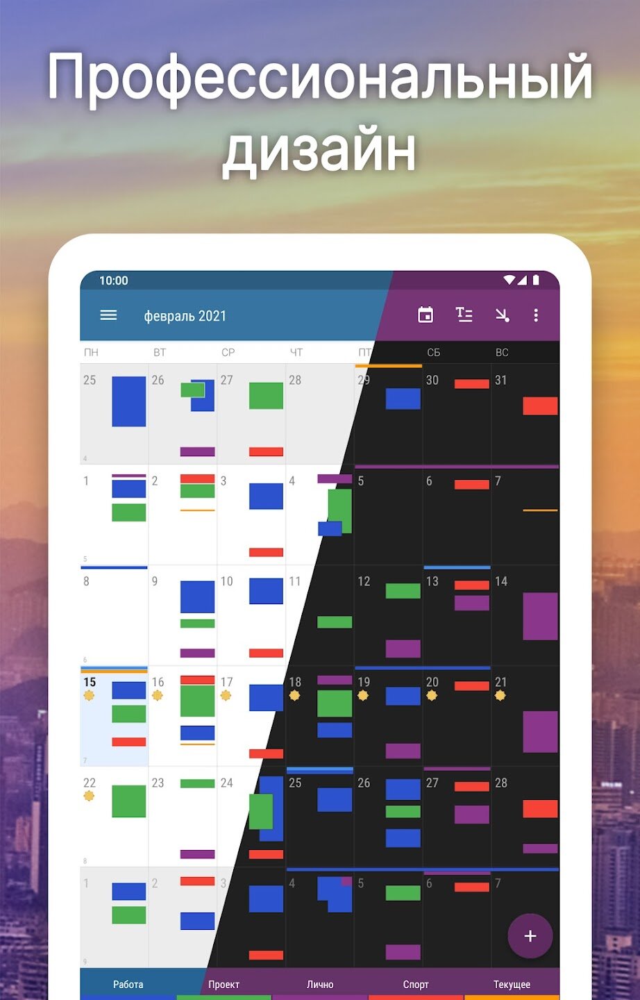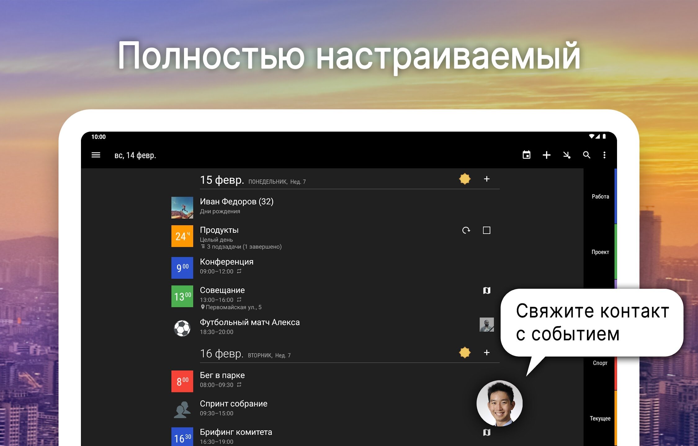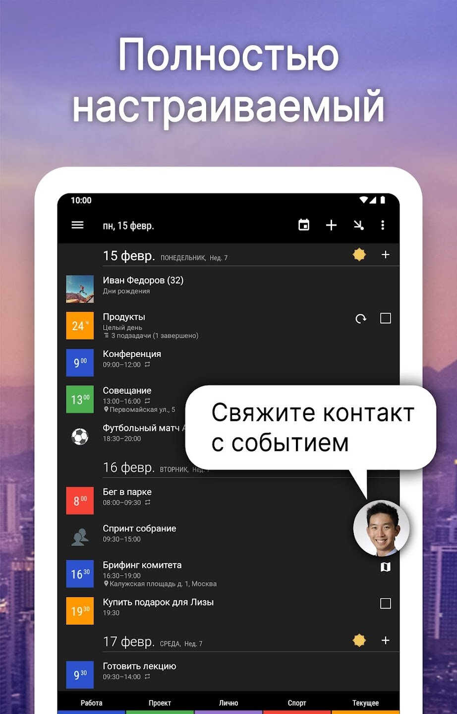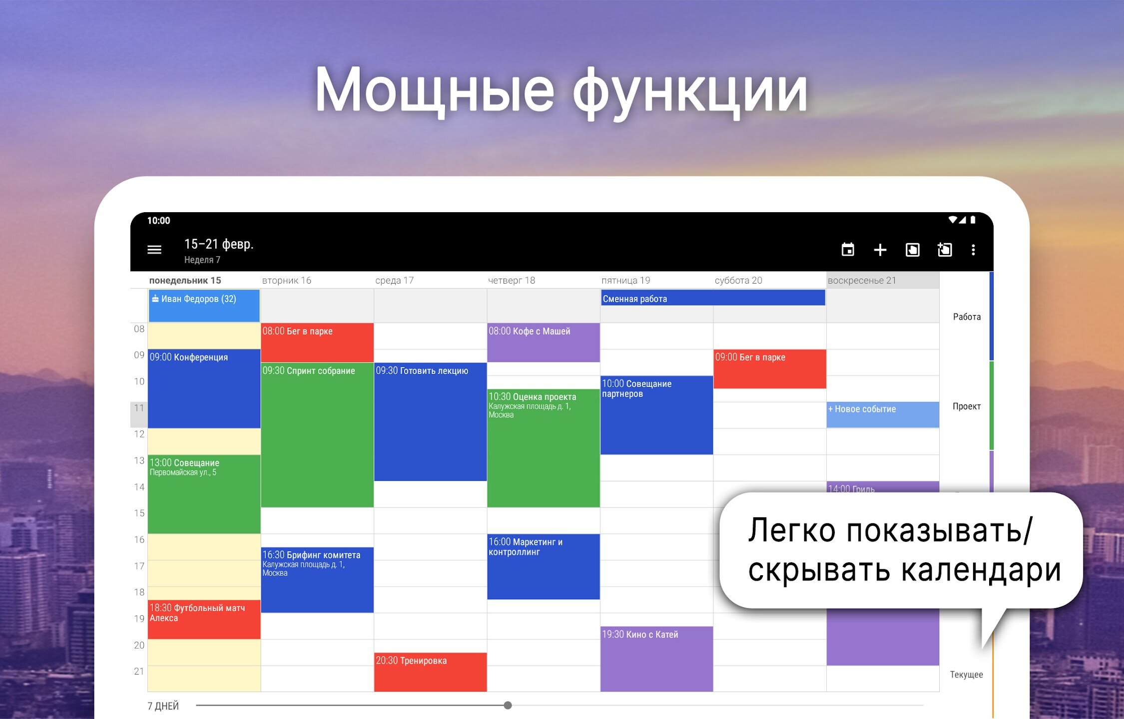 - Интеллектуальный ввод событий с предложениями и гибкими шаблонами повторения.
