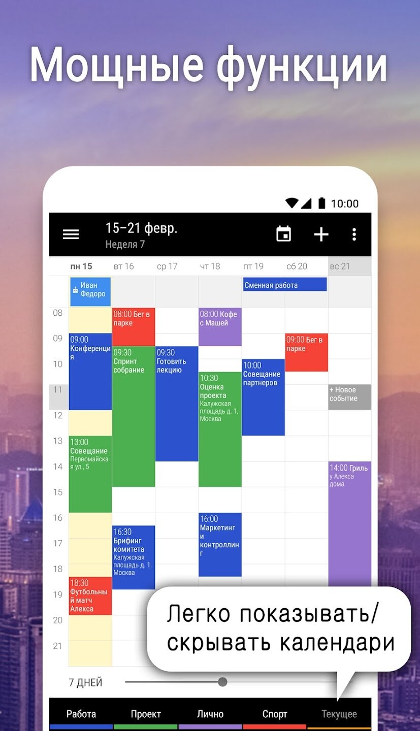- Синхронизация с Google Calendar, Microsoft Exchange и Outlook.